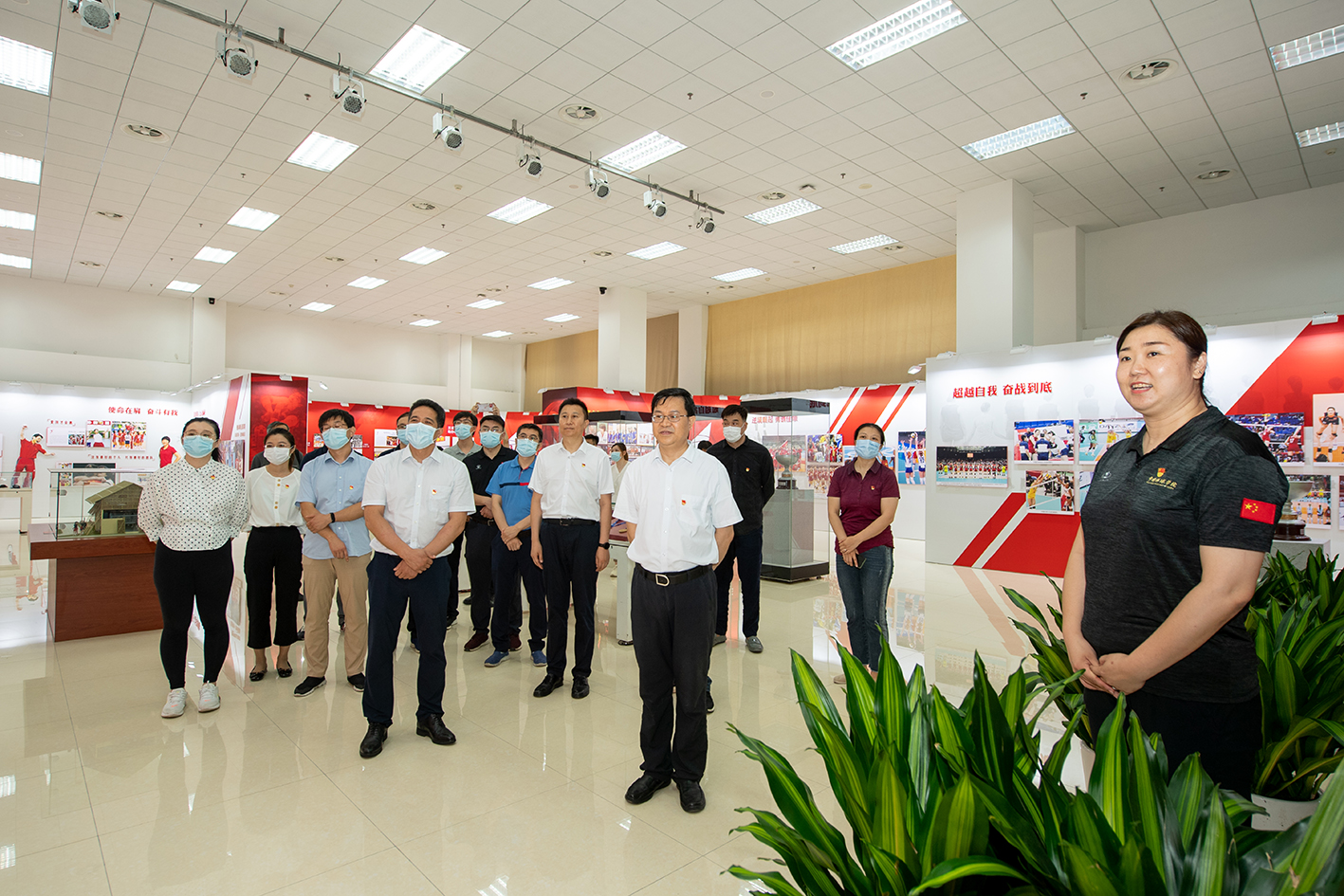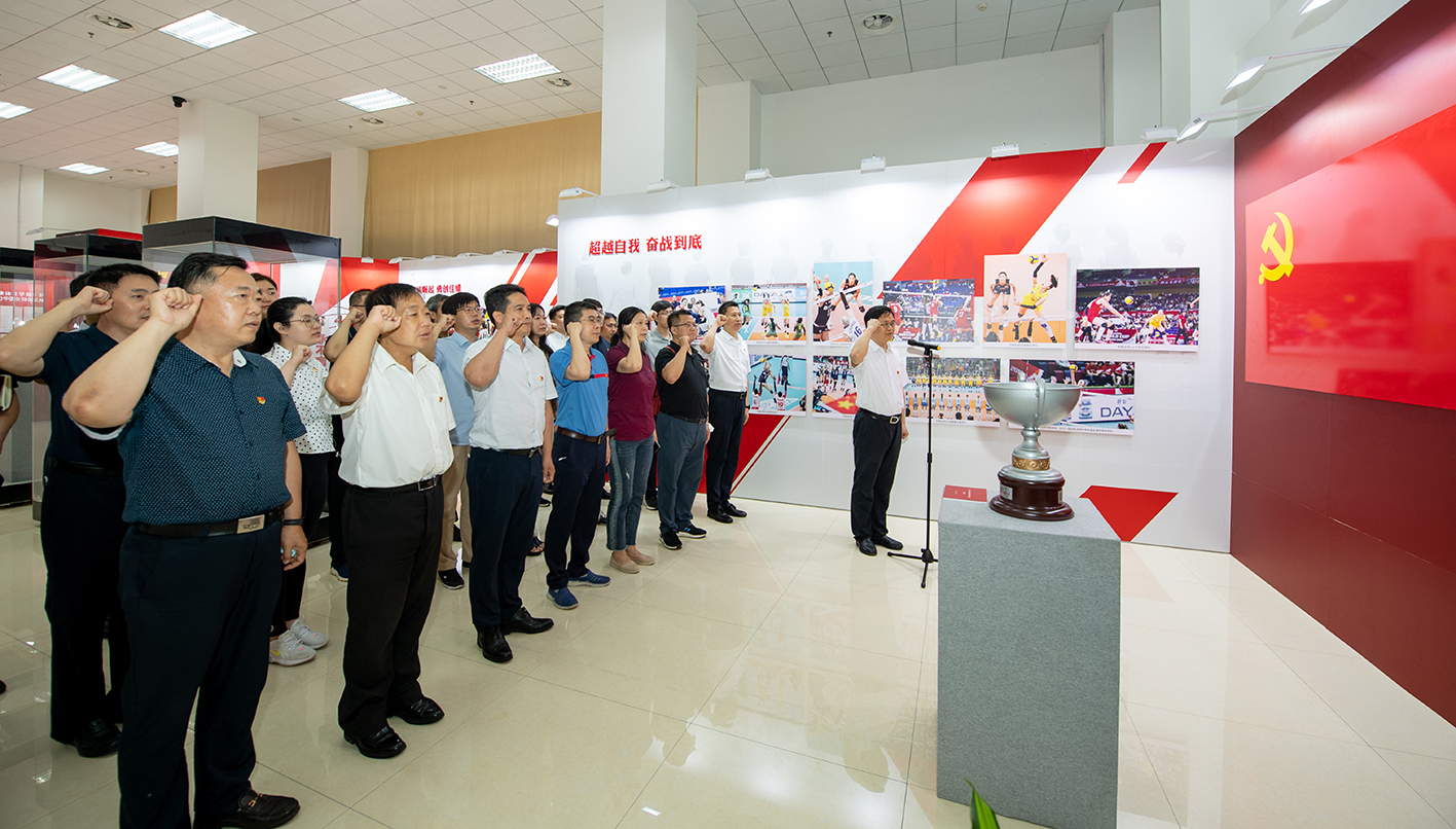 党日联学活动中,党员们在奥运冠军、中国排球学院常务副院长张娜带领下,参观了位于中国排球学院的“国家荣誉——中国女排精神展”,考察了普通高等学校体育单招统一考试考场武体馆,以及体能实验室。