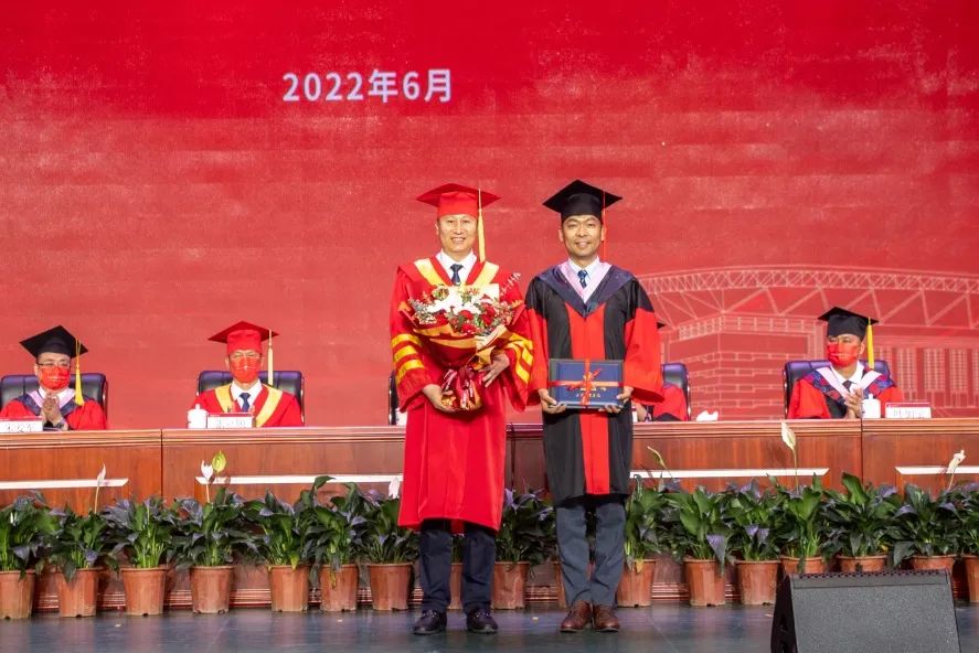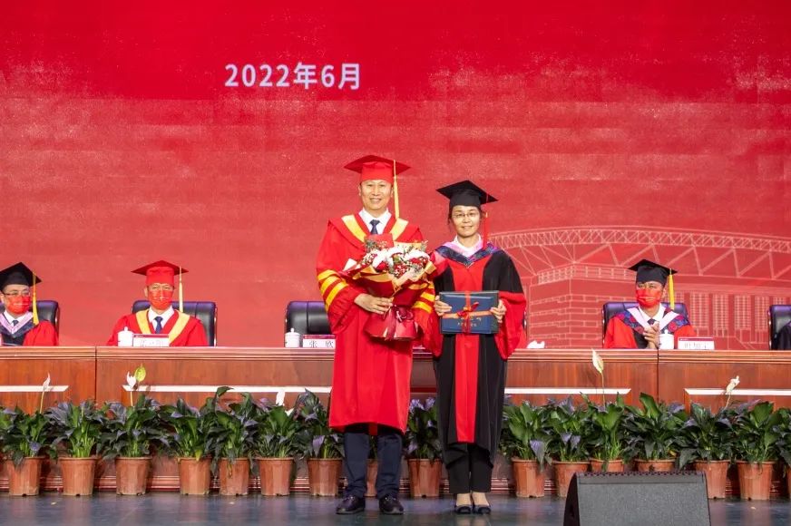 毕业典礼在升国旗仪式中拉开帷幕。宋爱军宣读beat365中文版官方网站2022届优秀毕业生表彰决定。教务处处长金宗强宣读beat365中文版官方网站2022届本科毕业生学位授予决定。科研与研究生处处长徐金陆宣读beat365中文版官方网站2022届硕士、博士毕业生学位授予决定。主席台就坐领导向优秀毕业生代表颁发荣誉证书和纪念品,向本科、硕士毕业生代表颁发了学位证书和毕业证书。张欣为到场的3名博士毕业生代表颁发了学位证书和毕业证书。