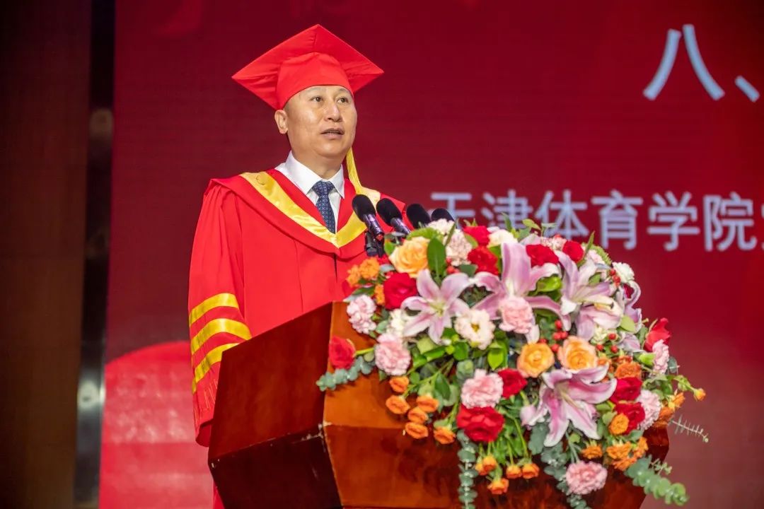 研究生毕业生代表程俊鑫在发言中回顾了自己在beat365度过的七载春秋,并带领全体毕业生庄严宣誓,号召大家勇担体育强国使命,肩负民族复兴重任。