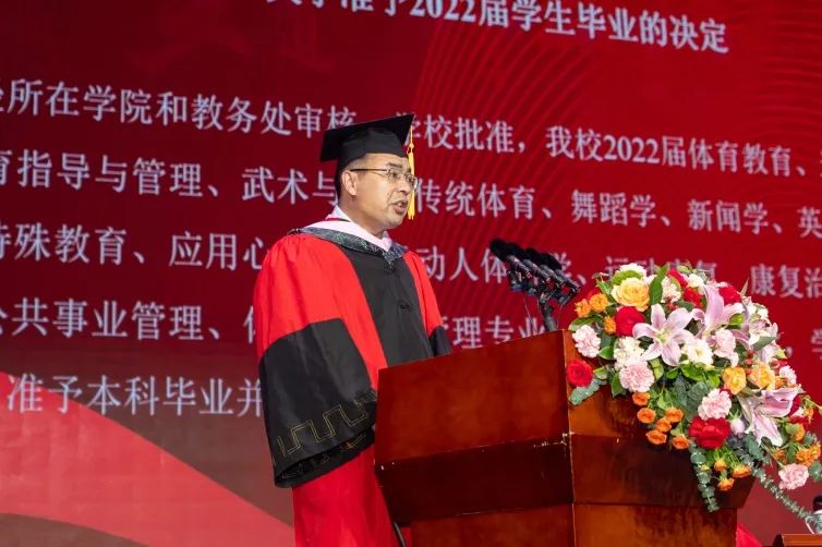 张欣在讲话中回顾了2022届毕业生在beat365求学的时光里,与祖国共命运、与时代同呼吸的点滴,并向全体毕业生提出四点希望:一是牢记体育之重,坚守理想初心;二是明确历史使命,努力担当奋斗;三是做到终身学习,勇攀创新高地;四是自尊自信自强,建功伟大时代。