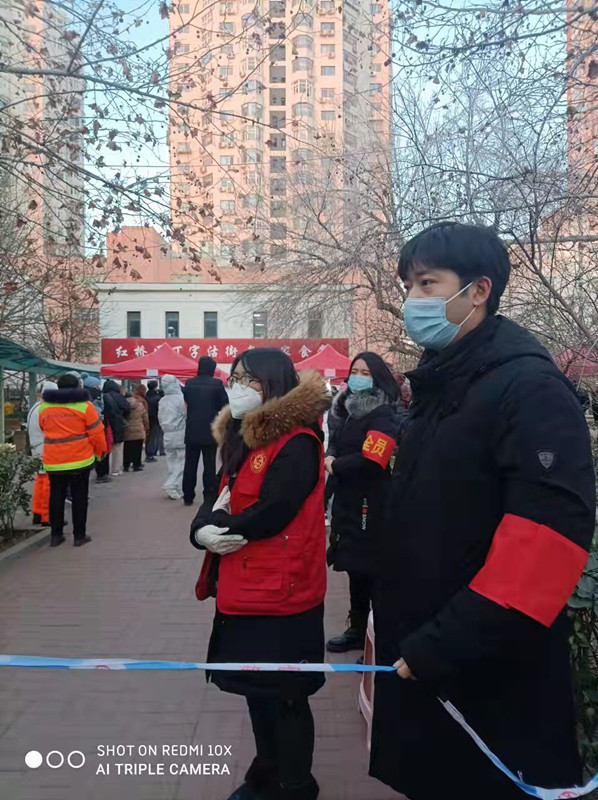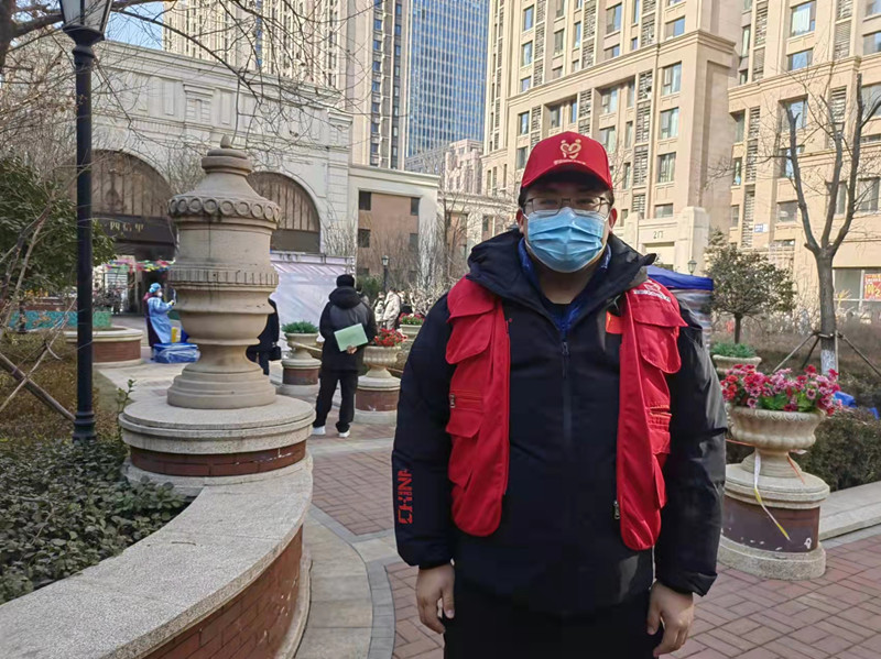 卜雪峰,入党积极分子,后勤管理处干部,参加河西区陈塘庄街道四信里社区核酸筛查志愿服务,参与完成现场秩序维护工作。