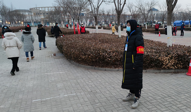 秦红军,中共党员,图书馆馆员,参加西青区开展的第四次全员核酸筛查,承担搬运物资、现场布置、维持秩序、人员登记疏导等。