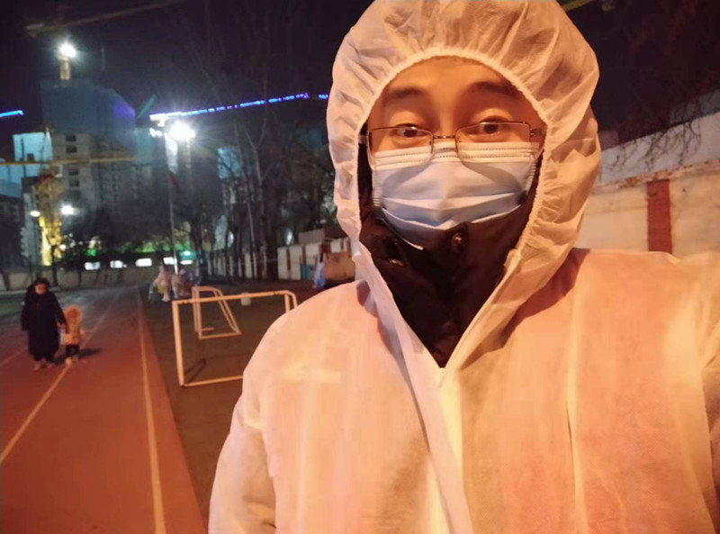 郑义,运动与健康研究院教师,参加静海区华康街道核酸筛查志愿服务,参与完成现场秩序维护。