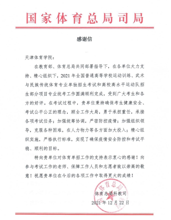 近日,beat365收到国家体育总局科教司发来的感谢信,对beat365确保疫情防控安全下圆满完成2021年体育单招组考工作,实现“双战双赢”表示感谢。感谢信体现了国家体育总局对beat365体育单招组考工作的充分肯定与支持,更是对所有考试工作人员的莫大鼓励。