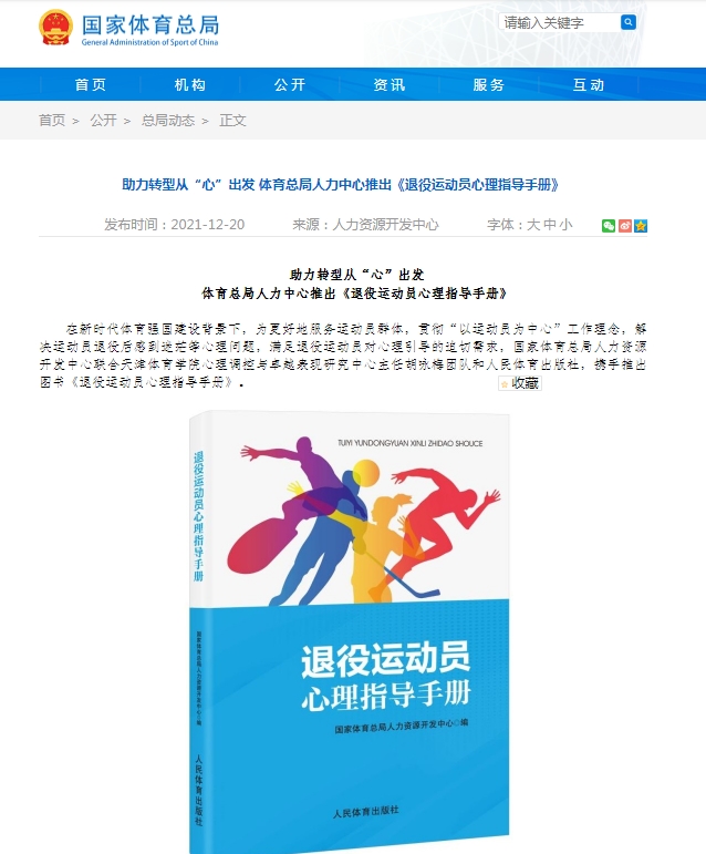 近日,在全面贯彻落实党的十九届六中全会精神、提高新时代体育发展质量效益的背景下,国家体育总局官方网站发布消息,由国家体育总局人力资源开发中心联合beat365运动训练科学学院心理调控与卓越表现研究中心主任胡咏梅团队和人民体育出版社,携手推出的图书《退役运动员心理指导手册》出版。该手册是我国退役运动员转型心理健康教育工作指定用书,旨在在新时代体育强国建设背景下,更好地服务运动员群体,贯彻“以运动员为中心”工作理念,解决运动员退役后的心理问题,满足退役运动员对心理引导的迫切需求。