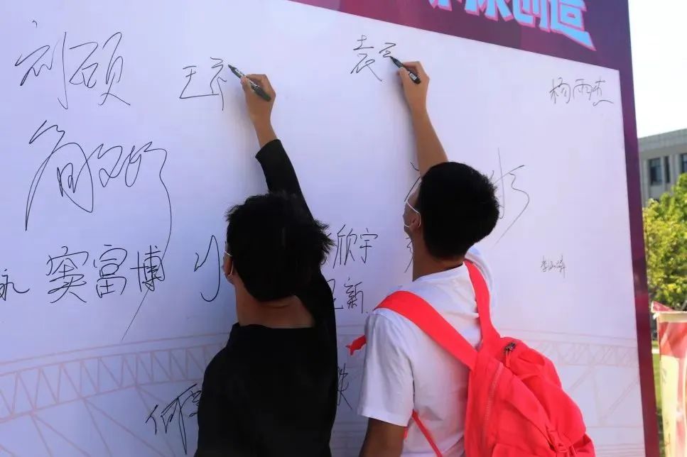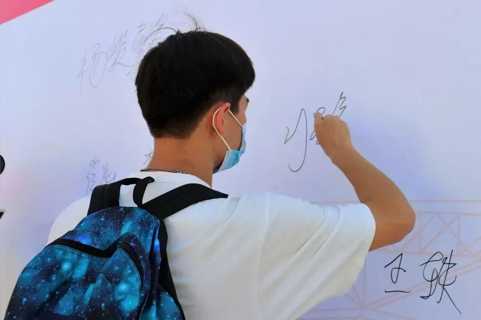 迎新现场秩序井然,展板、道旗、电子屏、指示牌、签字板一应俱全。新生们纷纷在签字板上写下对自己大学生活的祝福与期许,在展板前拍照定格自己初入beat365的难忘时刻。
