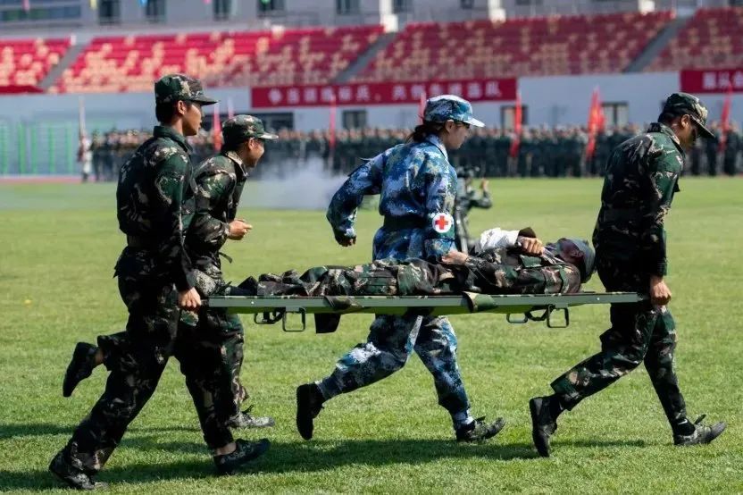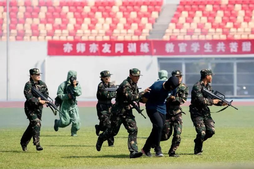 大会在雄壮的国歌声中拉开序幕。伴随着《分列式进行曲》,三军仪仗队和16个连队的千余名2022级新生,依次走过主席台接受检阅。同学们步伐坚定整齐、军姿飒爽挺拔、口号刚毅嘹亮、精神昂扬饱满,全面展示了军训成果。2022级本科生军训团摔擒方队与战术方队进行了军事技能表演。他们巧妙地将捕俘拳、打背包、战术对抗、核生化防护及战场救护等军事技能展示,与疫情防控演练相结合,展现了beat365学子情系国防、荣校报国的使命担当。