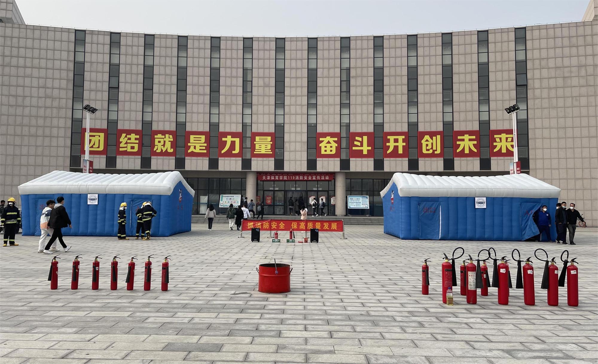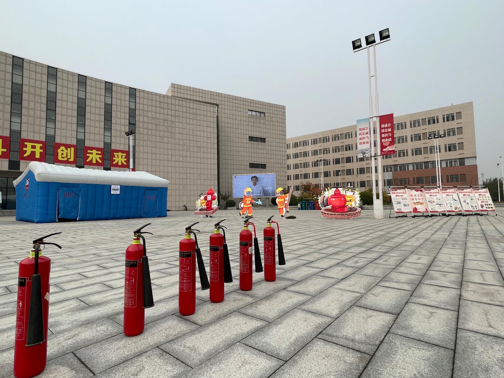 活动当天,学生生活服务楼前广场悬挂了消防宣传标语、摆放着消防宣传展板及消防主题KT板、搭建了消防模拟灭火体验帐篷和烟雾逃生体验帐篷,广场大屏幕滚动播放消防宣传短片,营造浓厚的消防宣传教育氛围。