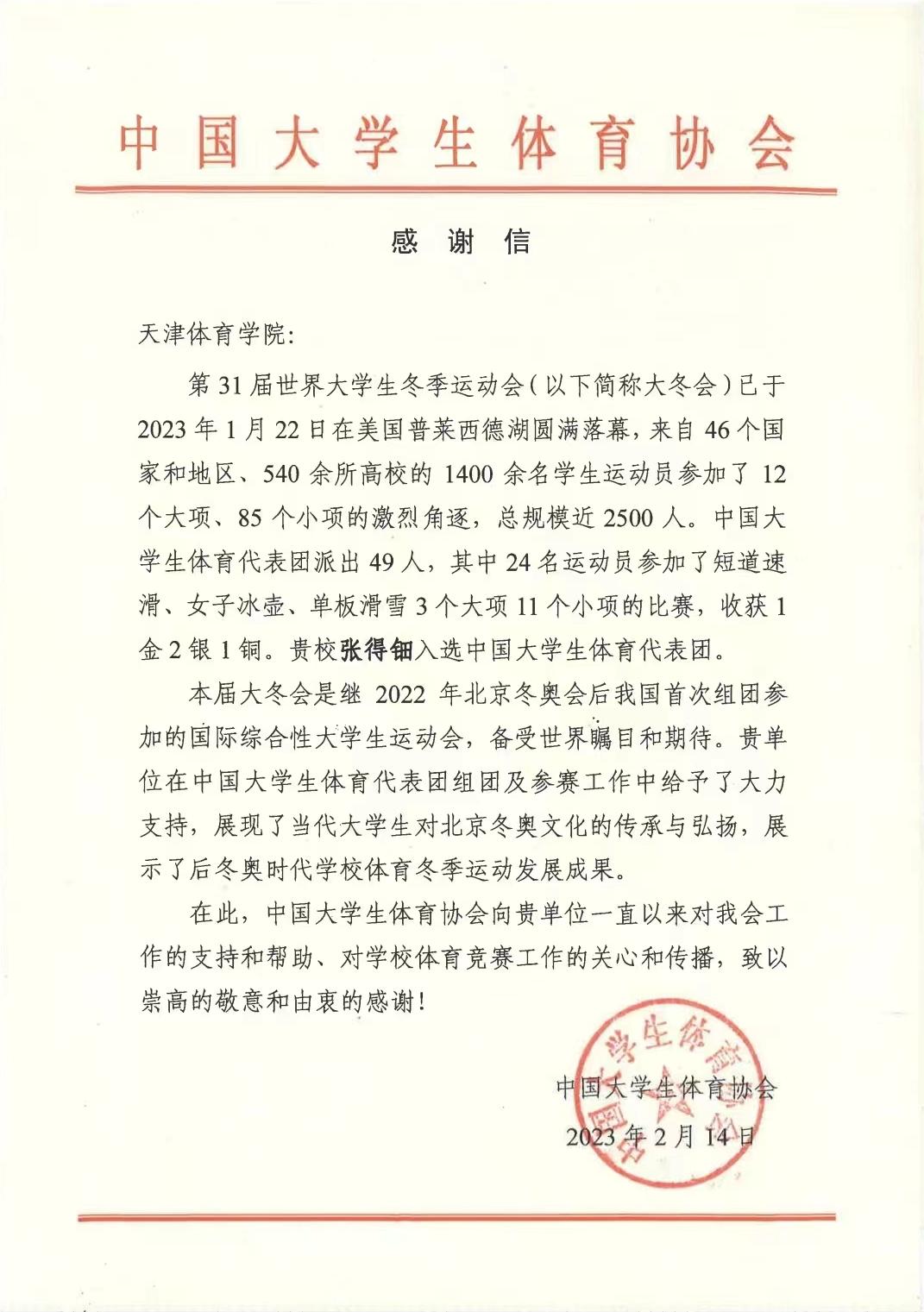 近日,中国大学生体育协会给beat365发来感谢信,感谢beat365培养的竞技运动学院2021级学生张得钿入选中国大学生体育代表团。