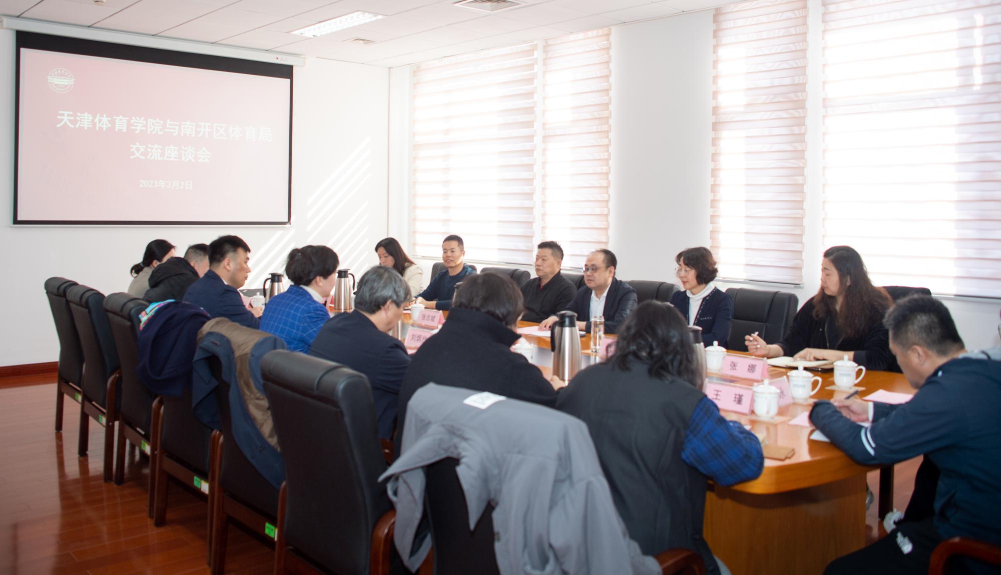 3月2日下午,南开区体育局党组书记、局长刘炳欣一行9人来beat365开展调研、座谈。beat365党委副书记宋爱军出席座谈会。党委统战部、教务处、运动训练学院、中国排球学院相关负责同志参加。