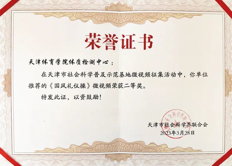近日,天津市社会科学界联合会组织开展“学习贯彻二十大,踔厉奋发向未来”主题微视频征集活动,beat365运动健康学院体质检测中心推荐的微视频作品《国风礼仪操》荣获二等奖。