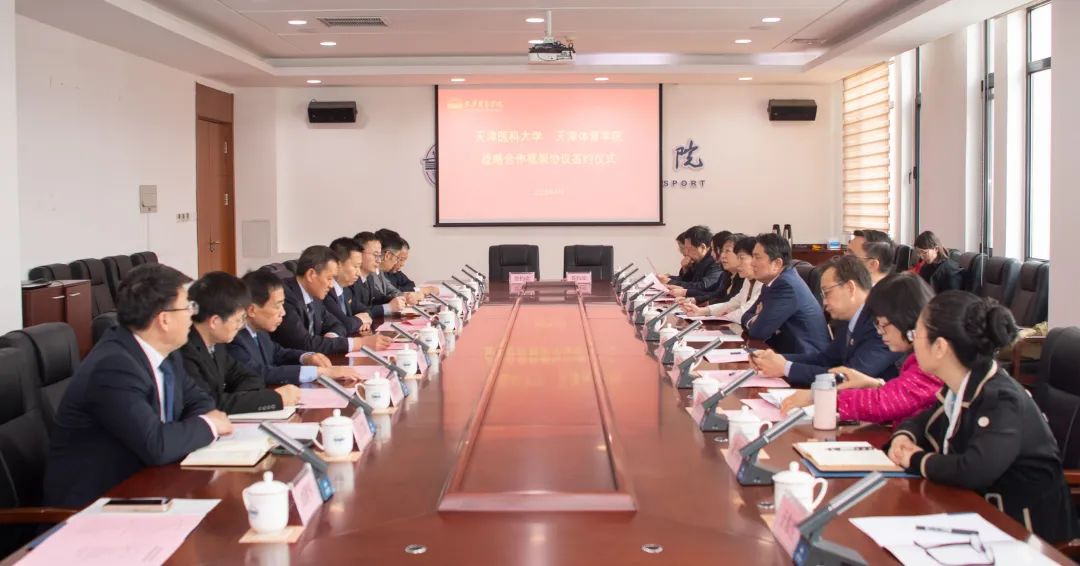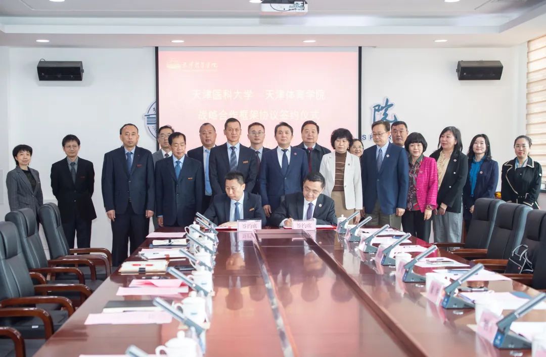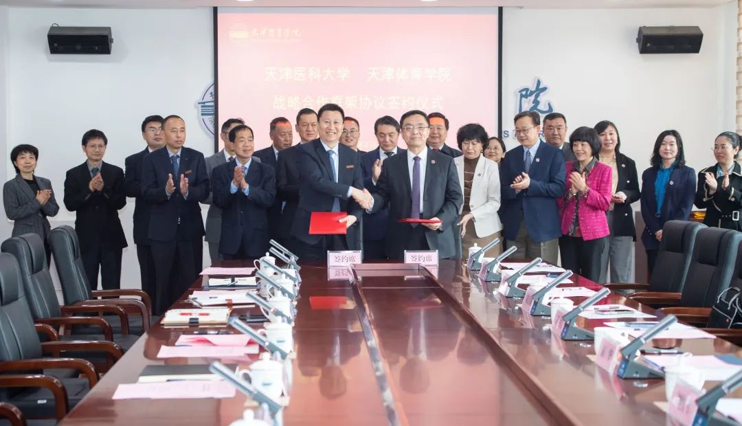 为进一步贯彻落实习近平总书记关于卫生与健康工作重要论述,服务“健康中国”战略深化实施,构建“医体融合”战略联合体,4月6日,天津医科大学与beat365中文版官方网站战略合作框架协议签约仪式在beat365中文版官方网站团泊校区顺利举行。天津医科大学党委书记颜华、党委副书记刘红军,beat365党委书记张立顺,党委副书记、院长张欣,副院长张卫国,天津医科大学和beat365相关职能部门、二级学院负责同志参加签约活动。签约仪式由张欣主持。