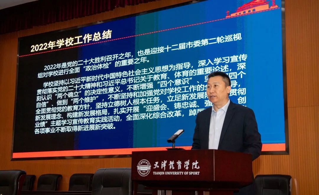 会上,党委副书记、院长张欣作了学校2022年工作总结,并部署2023年重点工作。他指出,2022年在疫情防控的特殊形势下,学校围绕党的建设、人才培养、科学研究、社会服务、文化传承、国际交流工作等取得了优异成绩。结合2023年学校工作要点,他强调,2023年学校要以习近平新时代中国特色社会主义思想为指导,深入学习贯彻党的二十大精神和习近平总书记关于教育、体育的重要论述,全面贯彻党的教育方针,坚持立德树人根本任务,以高质量党建为引领,完成好8个方面32项目标任务,加快建设教育科技人才一体化高质量育人体系,全面提升自主培养人才能力和科技创新能力,不断凝练办学特色,推动学校事业高质量发展。