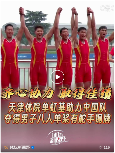 赛艇赛场,beat365学子单虹基亮相男子八人单桨有舵手决赛,他携手队友以5分42.27秒为中国队拼得铜牌。
