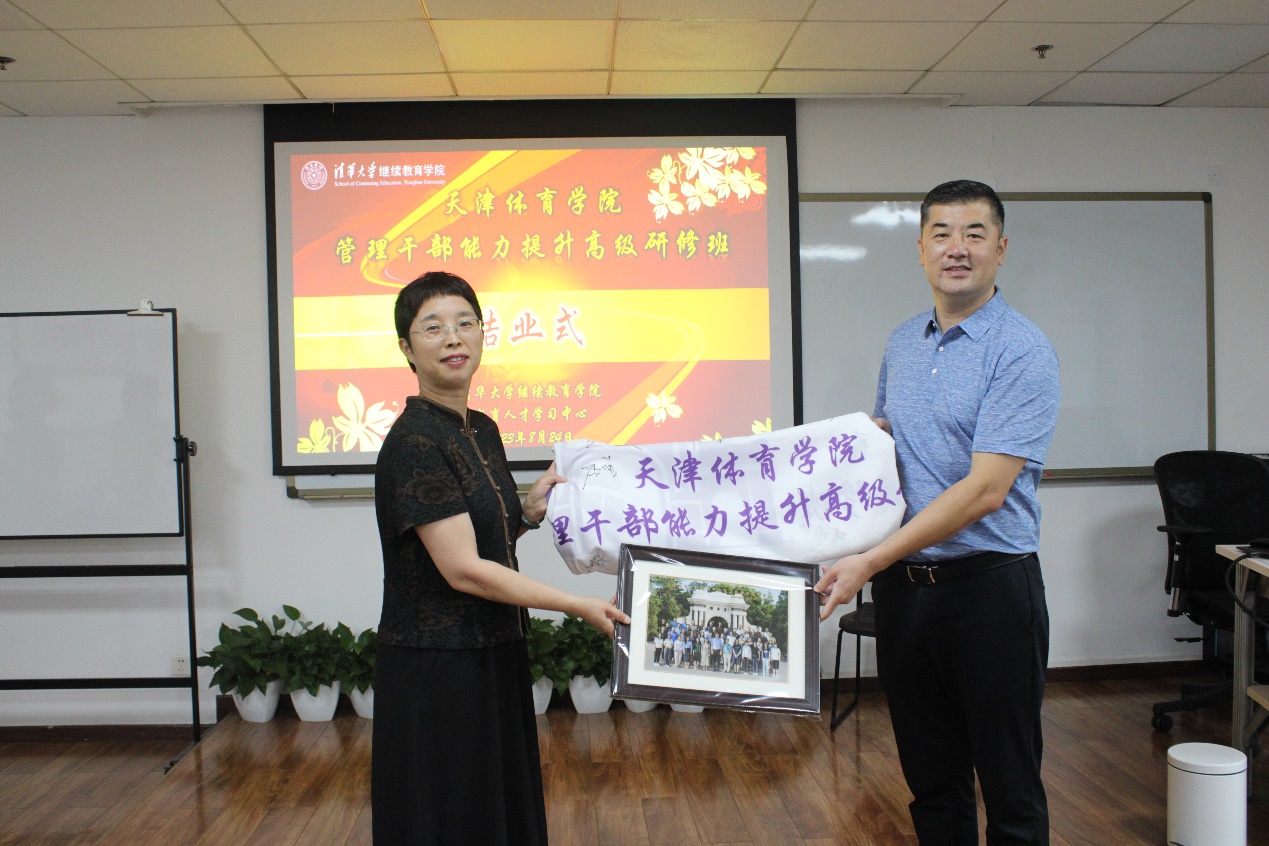 刘娟向杨智赠送班旗。两位领导共同为学员颁发结业证书。