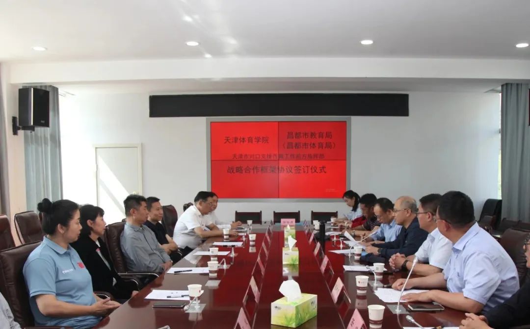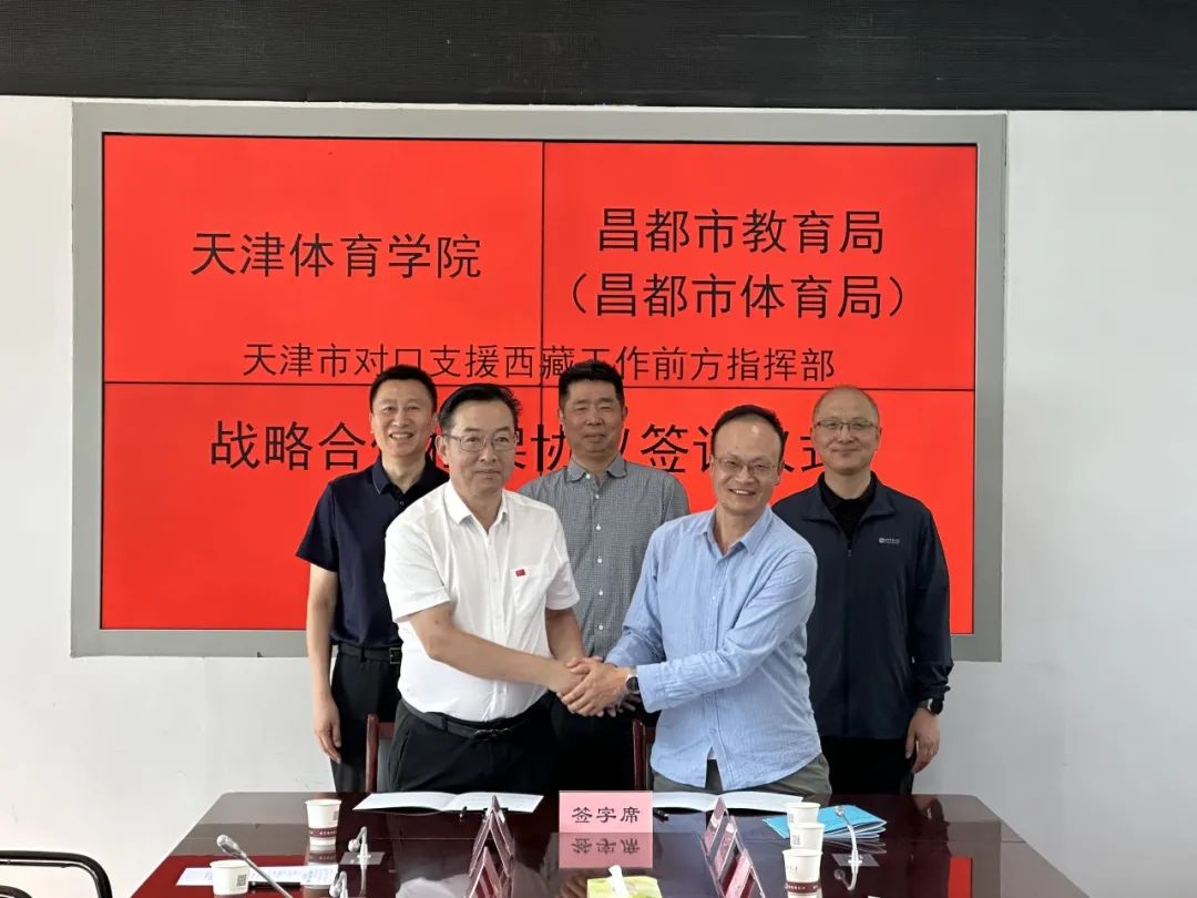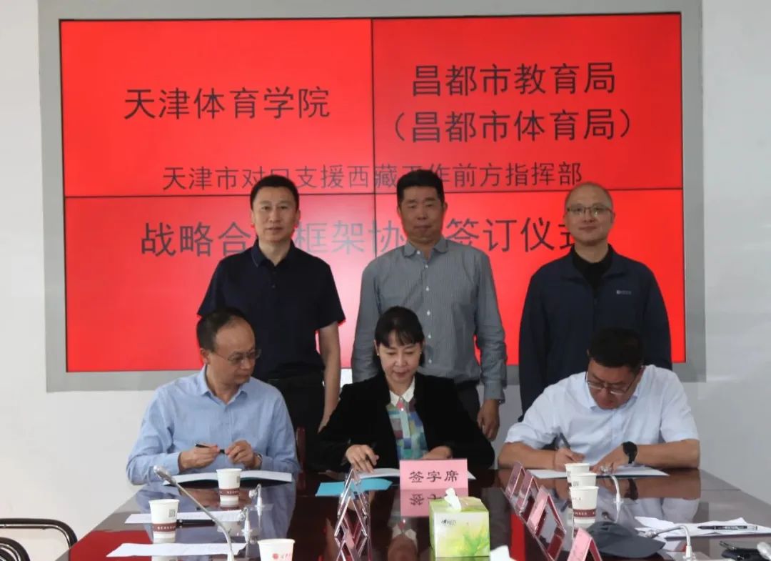 8月19日,在西藏昌都市,学校与天津市对口支援西藏工作前方指挥部、昌都市教育(体育)局签署战略合作三方协议,围绕教育教学质量提升、科研实训平台建设、援藏干部健康指导和青少年竞技体育后备人才培养等开展战略合作。天津市合作交流办公室副主任王东,beat365中文版官方网站党委副书记、院长张欣,天津市对口支援西藏工作前方指挥部总指挥张建华,昌都市教育局党组书记干宇出席签约仪式。张欣表示,三方签署战略合作协议是全面提升昌都市教育发展水平、服务教育强国建设的必然要求,beat365中文版官方网站将深入贯彻落实习近平总书记关于教育的重要论述和关于西藏工作的重要指示,全面服务昌都市所需,共同促进昌都市办学条件、办学理念、办学能力、师资队伍水平、育人效果显著提高,确保教育援藏工作不断取得新成效。