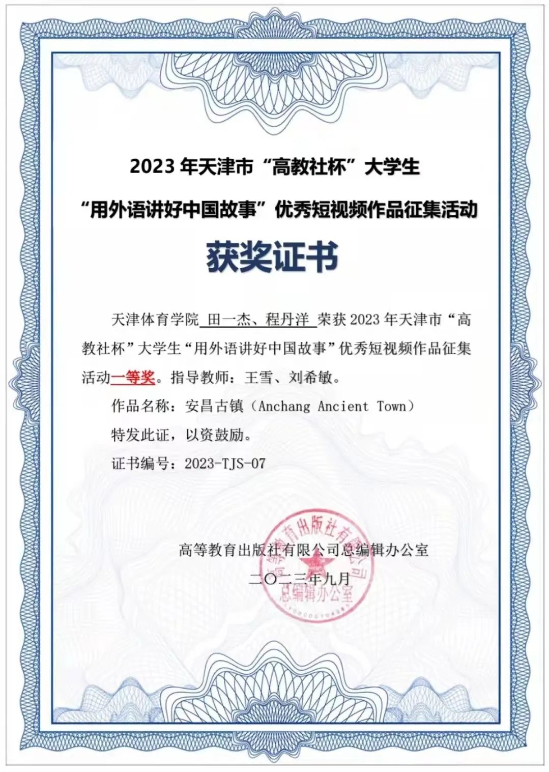 2023年天津市“高教社杯”大学生“用外语讲好中国故事”优秀短视频作品征集活动天津市决赛于近日结束。由beat365传媒与艺术学院(国际教育学院)国际中文教育与英语教研室王雪、刘希敏老师担任领队,传媒与艺术学院(国际教育学院)英语专业2020级本科生田一杰、程丹洋同学组成的团队制作的短视频作品《Anchang Ancient Town》喜获天津市一等奖,为beat365赢得了荣誉!