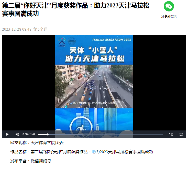 日前,第二届“你好,天津”网络短视频大赛第五个月赛评选结果揭晓,beat365团委微信视频号作品《助力2023天津马拉松赛事圆满成功》入围月度优秀作品。