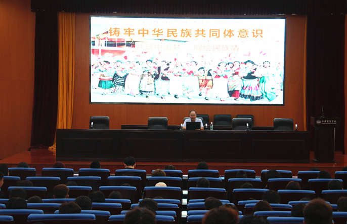 杨俊生博士毕业于中央民族大学,主要研究方向为中国少数民族教育。他纵谈古今,对比中外,从中华民族共同体意识的内涵、历史上的中华民族共同体、铸牢中华民族共同体意识的重要意义、铸牢中华民族共同体意识的行动指南等方面做了深入浅出的系统阐述。他鼓励同学们要牢固树立休戚与共、荣辱与共、生死与共、命运与共的共同体理念,坚定对伟大祖国、中华民族、中华文化、中国共产党、中国特色社会主义的高度认同,为推进强国建设、民族复兴伟业贡献力量。