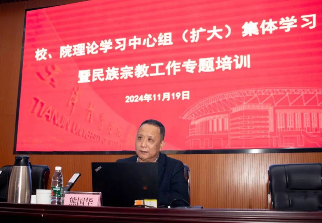 为深入学习贯彻习近平总书记关于加强和改进民族工作的重要思想、习近平总书记在全国民族团结进步表彰大会上的重要讲话精神,贯彻落实党的二十届三中全会精神,全面准确宣传贯彻党的民族宗教政策,提升民族宗教工作能力,11月19日,学校党委统战部牵头,联合党委组织部、党委宣传部共同开展校、院两级理论学习中心组(扩大)集体学习暨民族宗教工作专题培训。校领导班子成员、全体处级干部、党支部书记、二级党组织统战联络员、辅导员及第二期校级政治人才培养工程学员120余人参加培训。培训由党委副书记宋爱军主持。