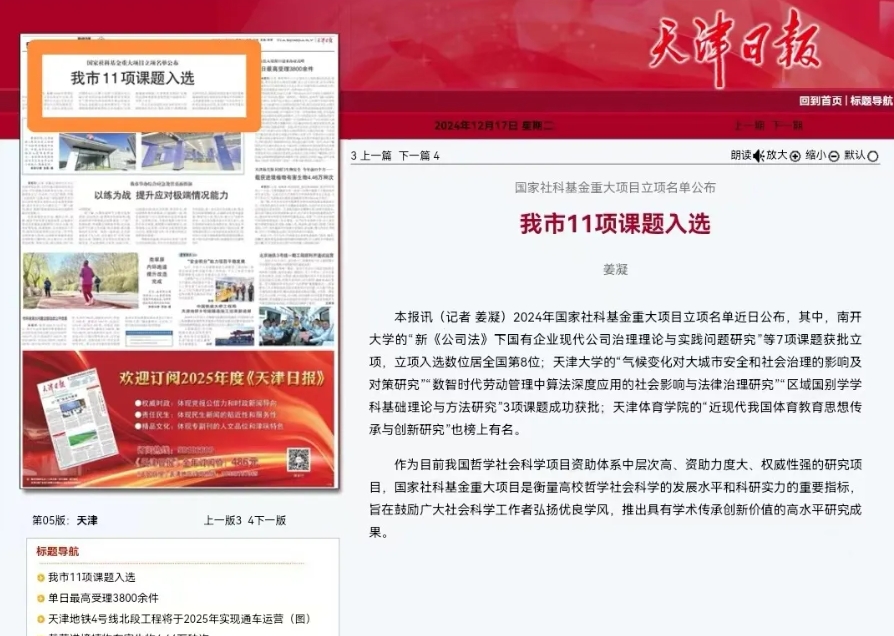 本报讯(记者 姜凝)2024年国家社科基金重大项目立项名单近日公布,其中,南开大学的“新《公司法》下国有企业现代公司治理理论与实践问题研究”等7项课题获批立项,立项入选数位居全国第8位;天津大学的“气候变化对大城市安全和社会治理的影响及对策研究”“数智时代劳动管理中算法深度应用的社会影响与法律治理研究”“区域国别学学科基础理论与方法研究”3项课题成功获批;beat365中文版官方网站的“近现代我国体育教育思想传承与创新研究”也榜上有名。