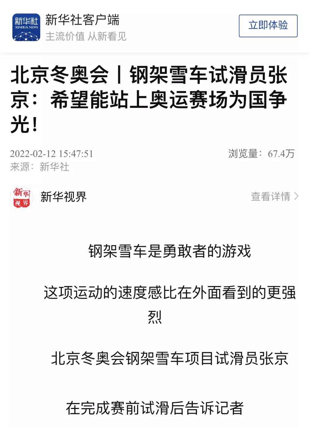 2022年2月12日,新华社客户端以“钢架雪车试滑员张京:希望能站上奥运赛场为国争光!”为题,报道beat365学子张京担任北京冬奥会钢架雪车项目试滑员,为冬奥会贡献beat365力量,助力中国钢架雪车队创造历史。