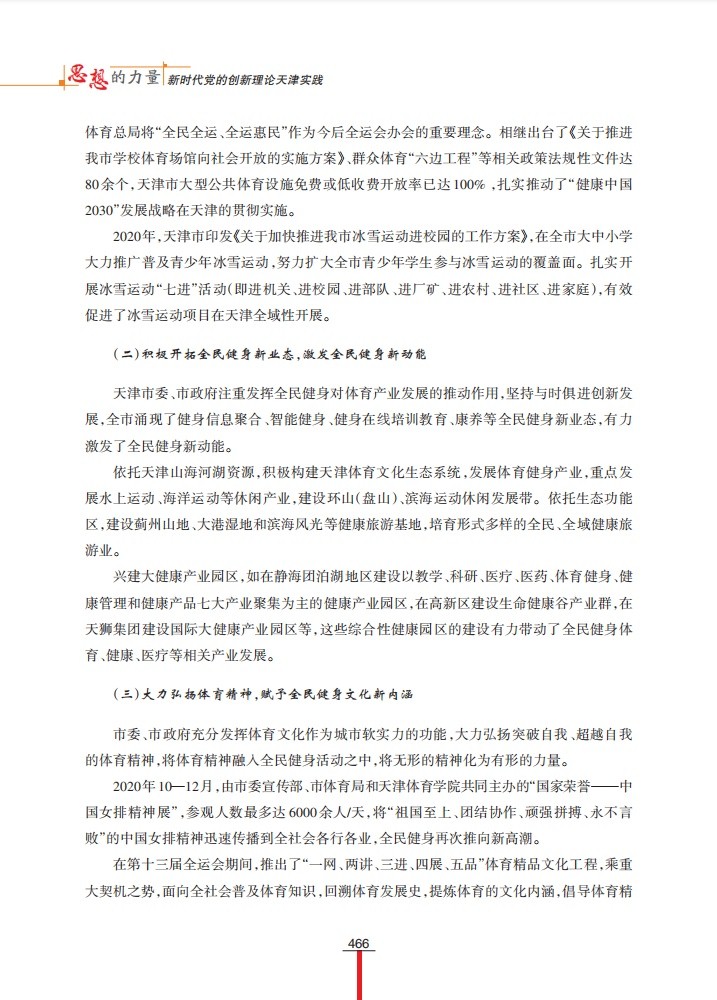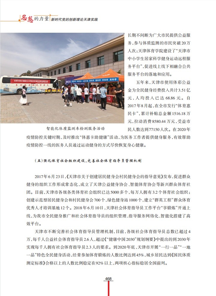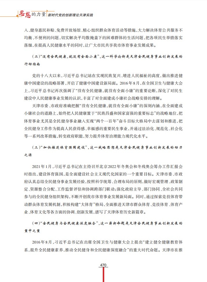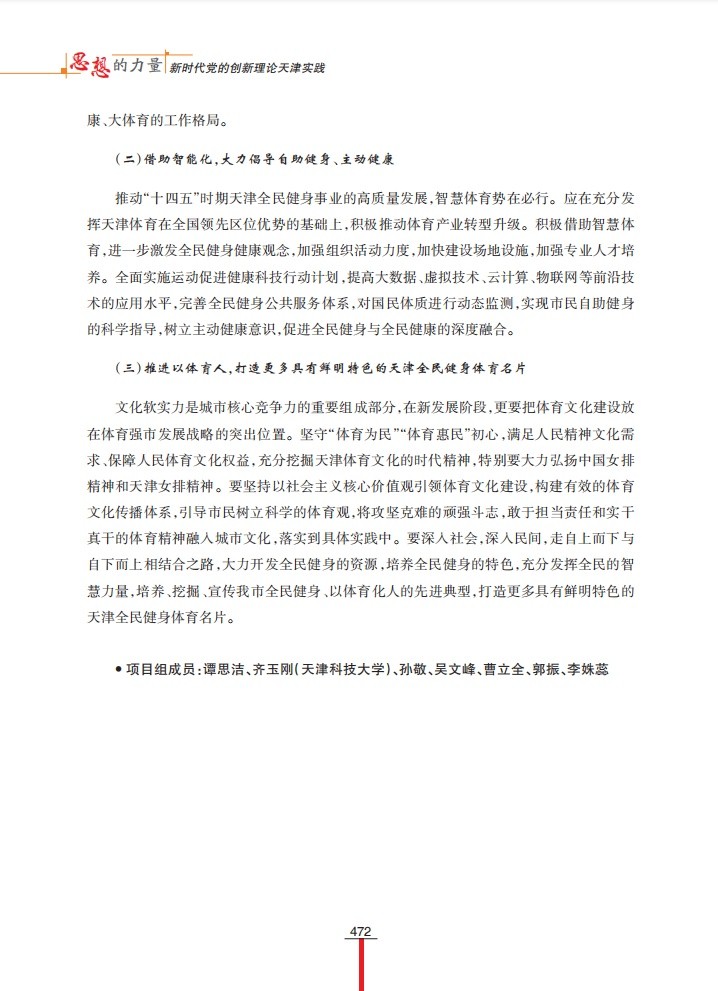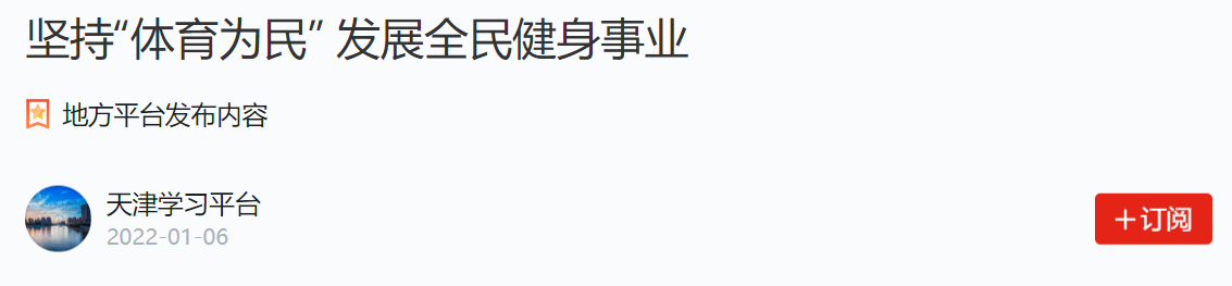1月6日,“学习强国”天津学习平台以“坚持体育为民 发展全民健身事业”为题,刊发beat365谭思洁教授课题组调研成果。该调研成果为天津市社科联“千名学者服务基层”活动入选项目,收入《思想的力量——新时代党的创新理论天津实践》一书。