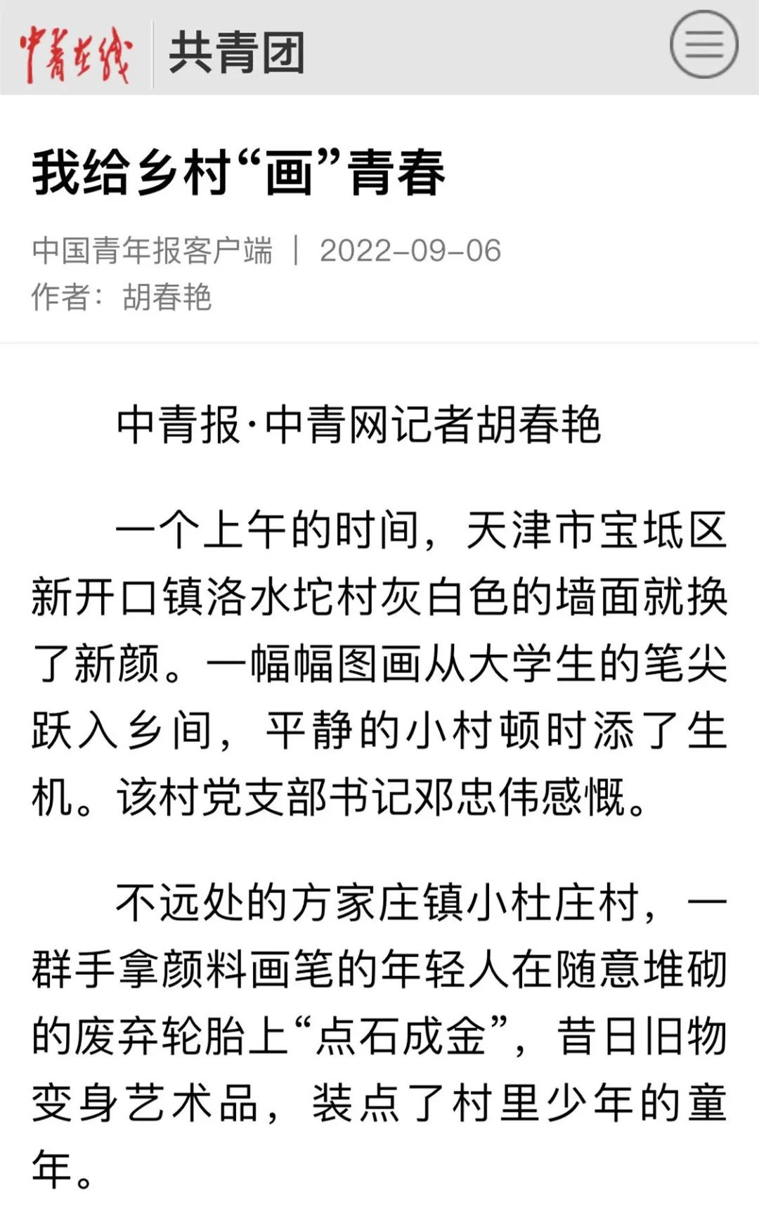 日前,中国青年报客户端报道beat365社会实践团的师生们走出课堂,来到乡村,围绕乡村振兴,以“青山绿水、家禽嬉戏、五谷丰登”为主题,将对美丽乡村的无尽畅想搬上墙面,激发乡村发展新活力。