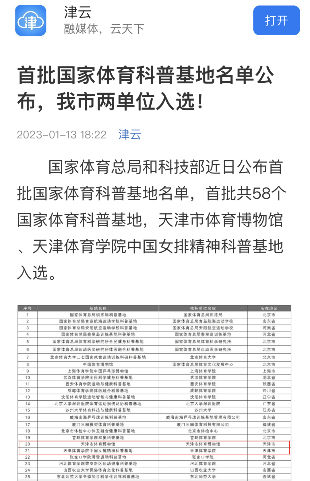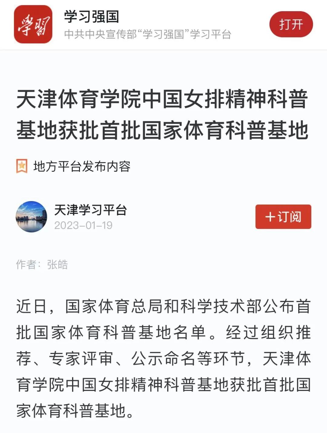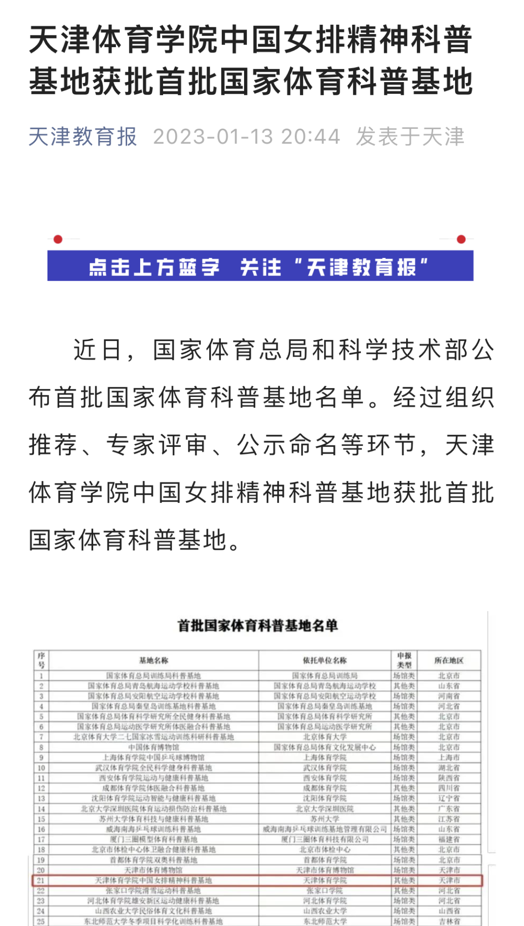 近日,国家体育总局和科学技术部公布首批国家体育科普基地名单。经过组织推荐、专家评审、公示命名等环节,beat365中国女排精神科普基地获批首批国家体育科普基地。央广网、中国新闻网、学习强国、天津日报新媒体、津云、天津教育报新媒体等中央和我市多家媒体对此进行了报道。
