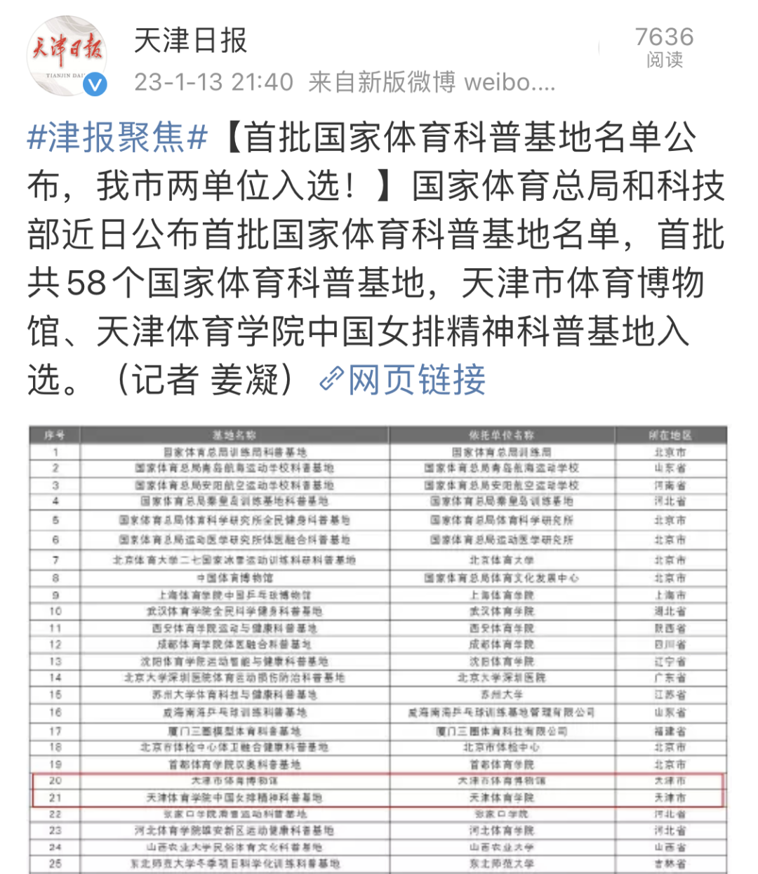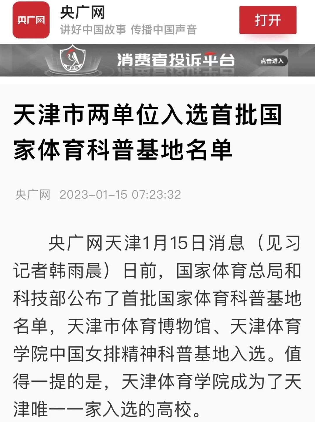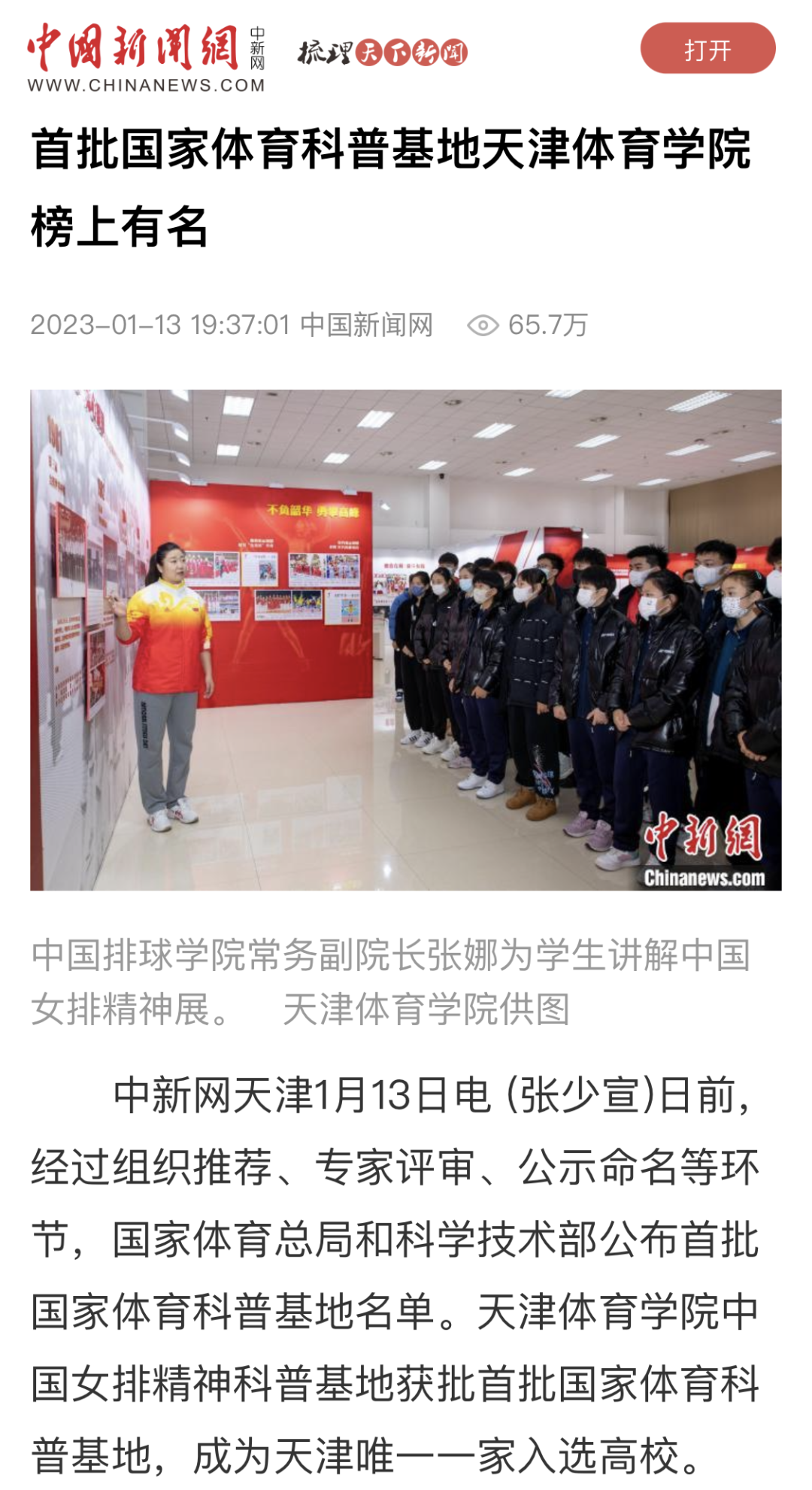 近日,国家体育总局和科学技术部公布首批国家体育科普基地名单。经过组织推荐、专家评审、公示命名等环节,beat365中国女排精神科普基地获批首批国家体育科普基地。央广网、中国新闻网、学习强国、天津日报新媒体、津云、天津教育报新媒体等中央和我市多家媒体对此进行了报道。