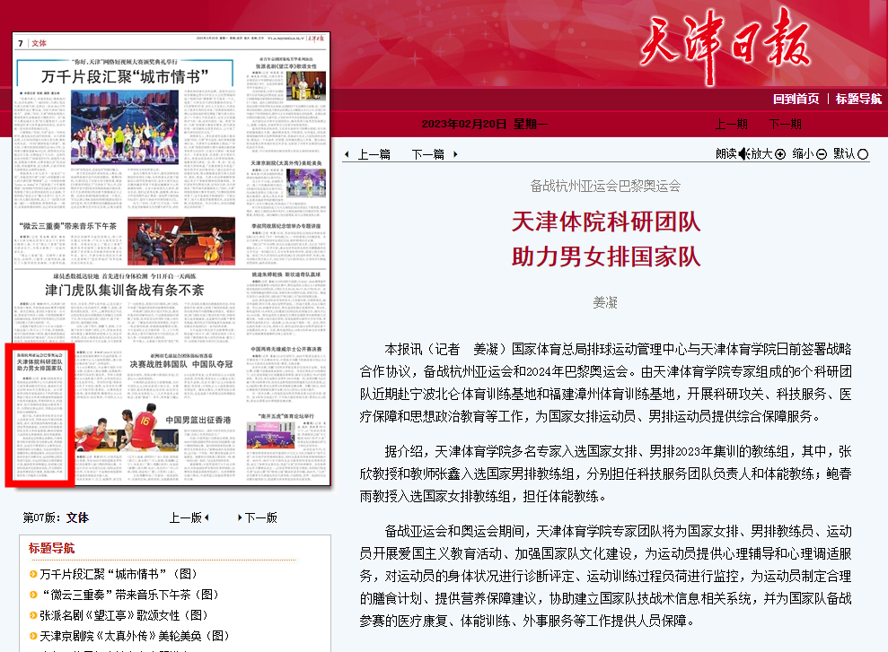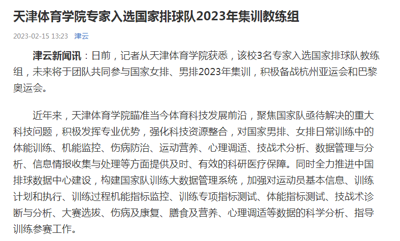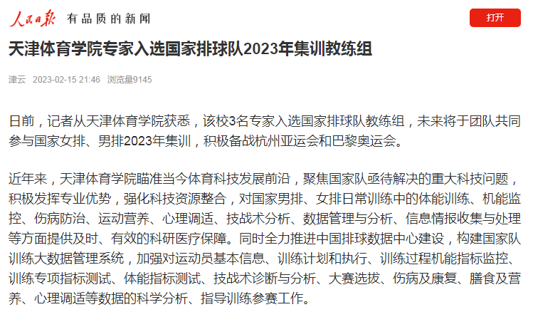 近日,人民日报客户端、中国新闻网、《天津日报》、津云、《天津教育报》等中央和我市多家媒体对beat365科研团队全面助力国家男排、女排备战巴黎奥运会进行了报道。