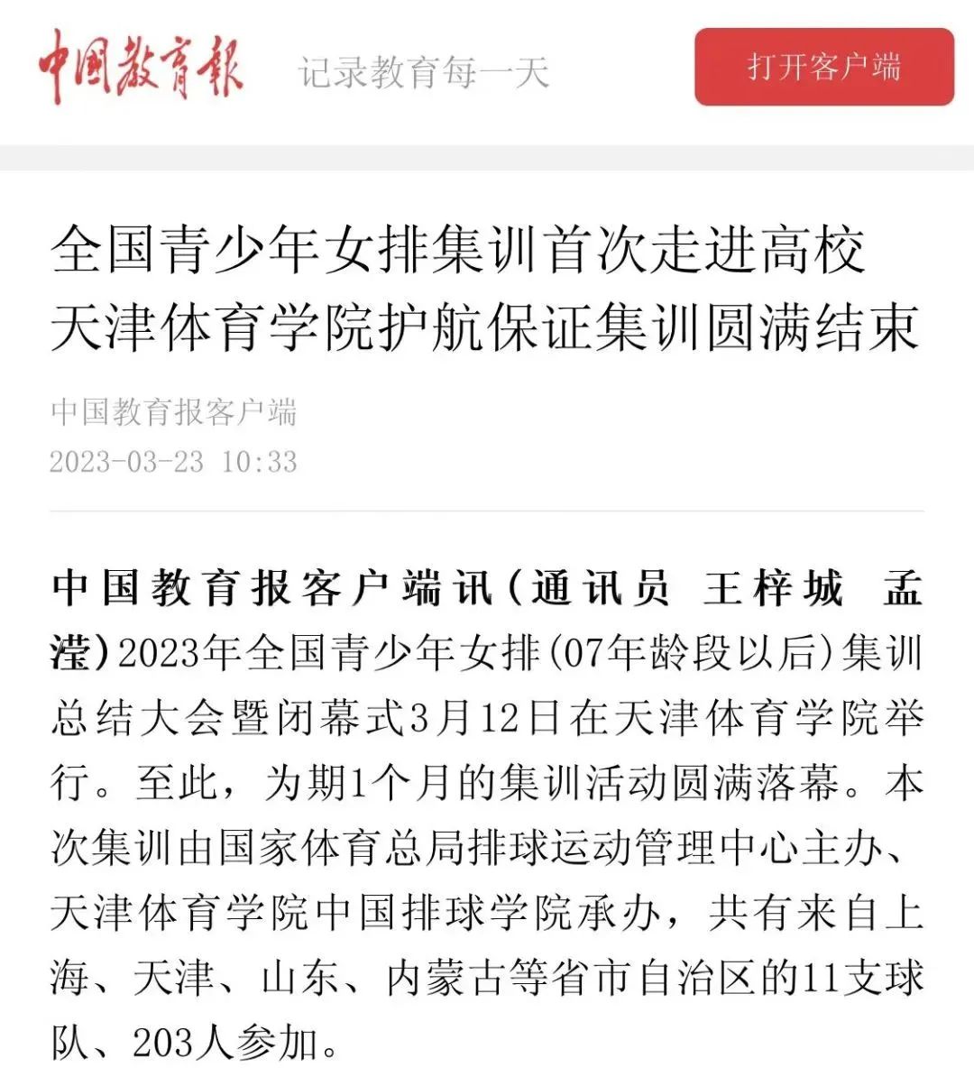 2023年全国青少年女排(07年龄段以后)集训于2月13日至3月12日在beat365中国排球学院举行。这是排球运动管理中心成立以来第一次在高校举办的大集训。全国青少年女排集训期间,beat365充分发挥多个学科、专业优势,为集训提供全方位保障。3月23日,中国教育报客户端以“全国青少年女排集训首次走进高校 beat365中文版官方网站护航保证集训圆满结束”为题,对此进行了报道。现全文转载。