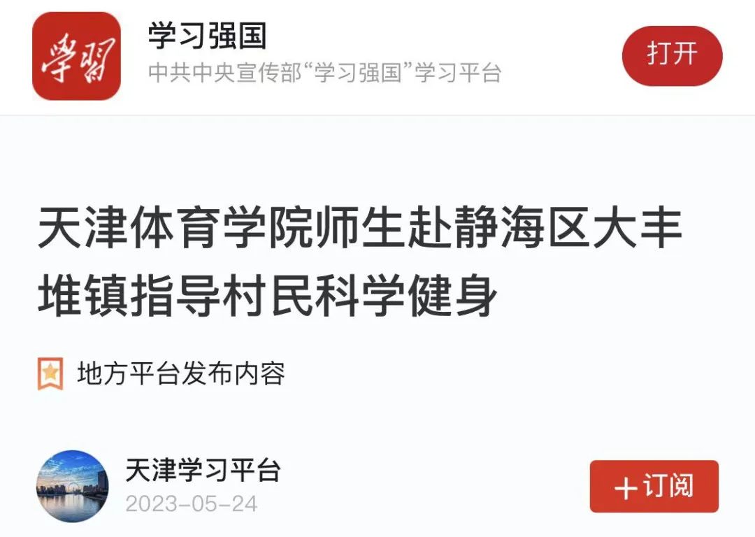 日前,学习强国“天津学习平台”报道beat365深入开展学习贯彻习近平新时代中国特色社会主义思想主题教育,组织师生赴静海区大丰堆镇后明庄村,参加由市政协组织的“为群众办实事”活动,助力乡镇社区居民养成科学合理的体育运动习惯,全面提高人民群众身体素质。现全文转载。