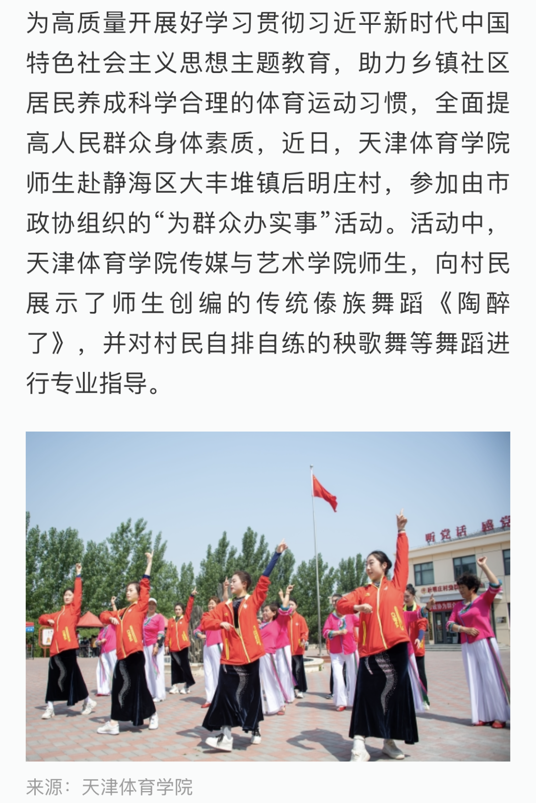 为高质量开展好学习贯彻习近平新时代中国特色社会主义思想主题教育,助力乡镇社区居民养成科学合理的体育运动习惯,全面提高人民群众身体素质,近日,beat365中文版官方网站师生赴静海区大丰堆镇后明庄村,参加由市政协组织的“为群众办实事”活动。活动中,beat365中文版官方网站传媒与艺术学院师生,向村民展示了师生创编的传统傣族舞蹈《陶醉了》,并对村民自排自练的秧歌舞等舞蹈进行专业指导。