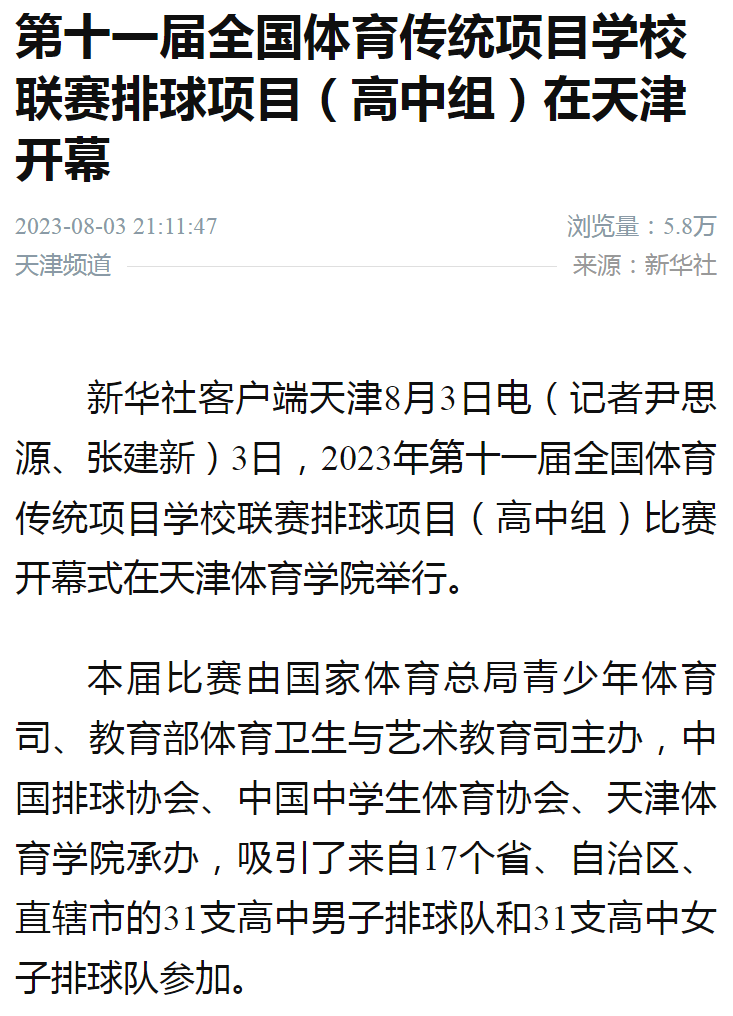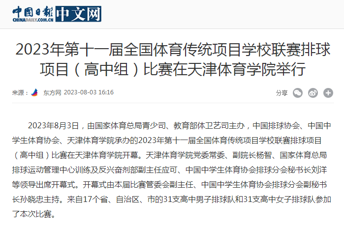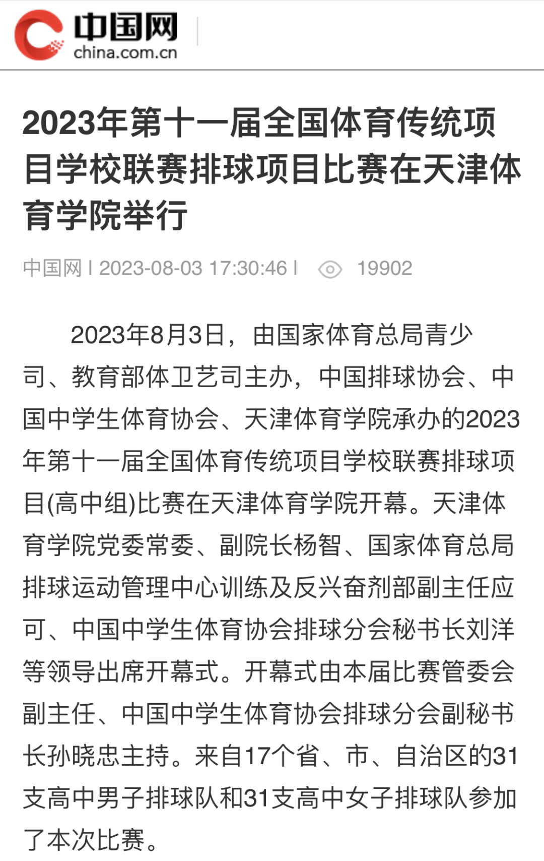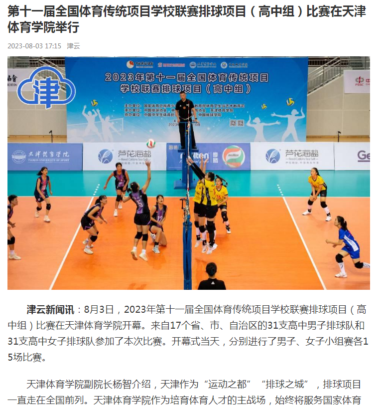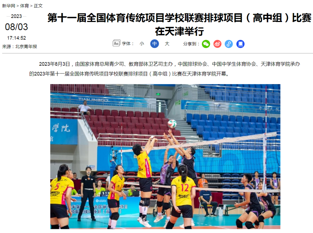 2023年8月3日,由国家体育总局青少司、教育部体卫艺司主办,中国排球协会、中国中学生体育协会、beat365中文版官方网站承办的2023年第十一届全国体育传统项目学校联赛排球项目(高中组)比赛在beat365中文版官方网站开幕。来自17个省、自治区、直辖市的31支高中男子排球队和31支高中女子排球队参加了本次比赛。新华社、新华网、中国网、中国日报、光明网、《天津日报》、津云、天津广播、天津教育报新媒体、天津教育新媒体等中央和我市多家媒体对此进行了报道。