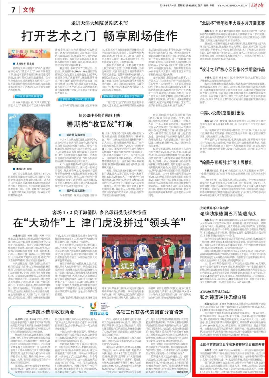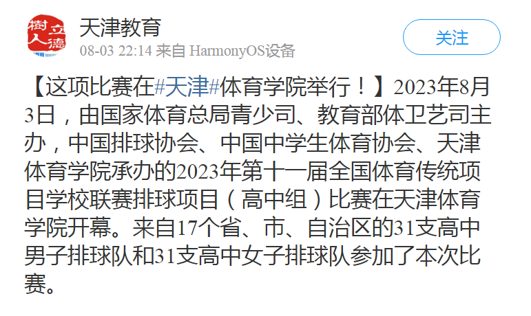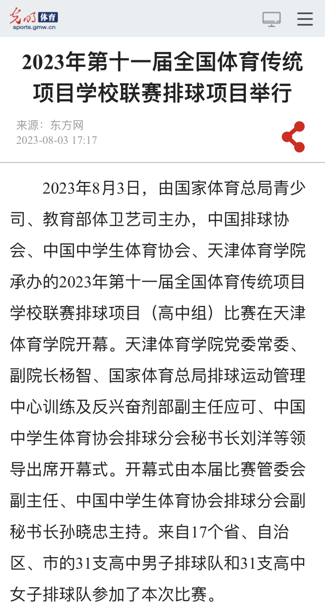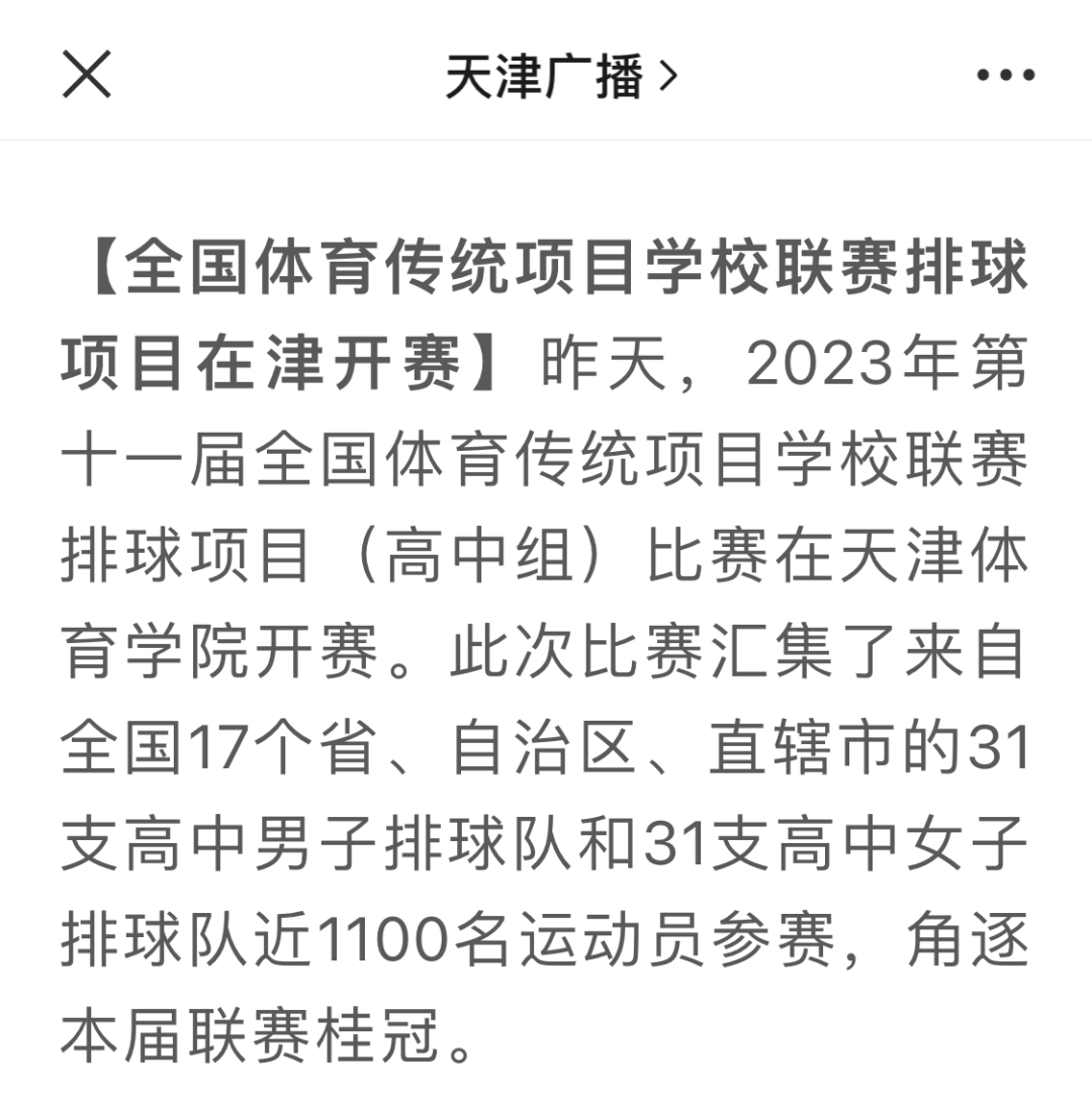 2023年8月3日,由国家体育总局青少司、教育部体卫艺司主办,中国排球协会、中国中学生体育协会、beat365中文版官方网站承办的2023年第十一届全国体育传统项目学校联赛排球项目(高中组)比赛在beat365中文版官方网站开幕。来自17个省、自治区、直辖市的31支高中男子排球队和31支高中女子排球队参加了本次比赛。新华社、新华网、中国网、中国日报、光明网、《天津日报》、津云、天津广播、天津教育报新媒体、天津教育新媒体等中央和我市多家媒体对此进行了报道。
