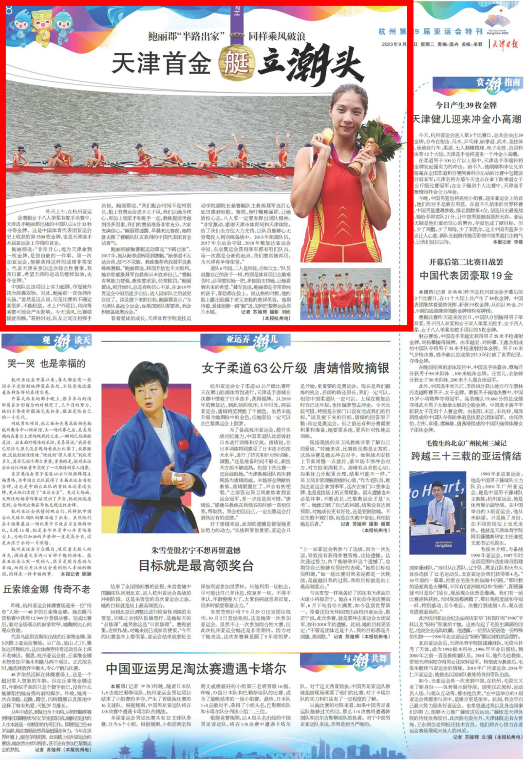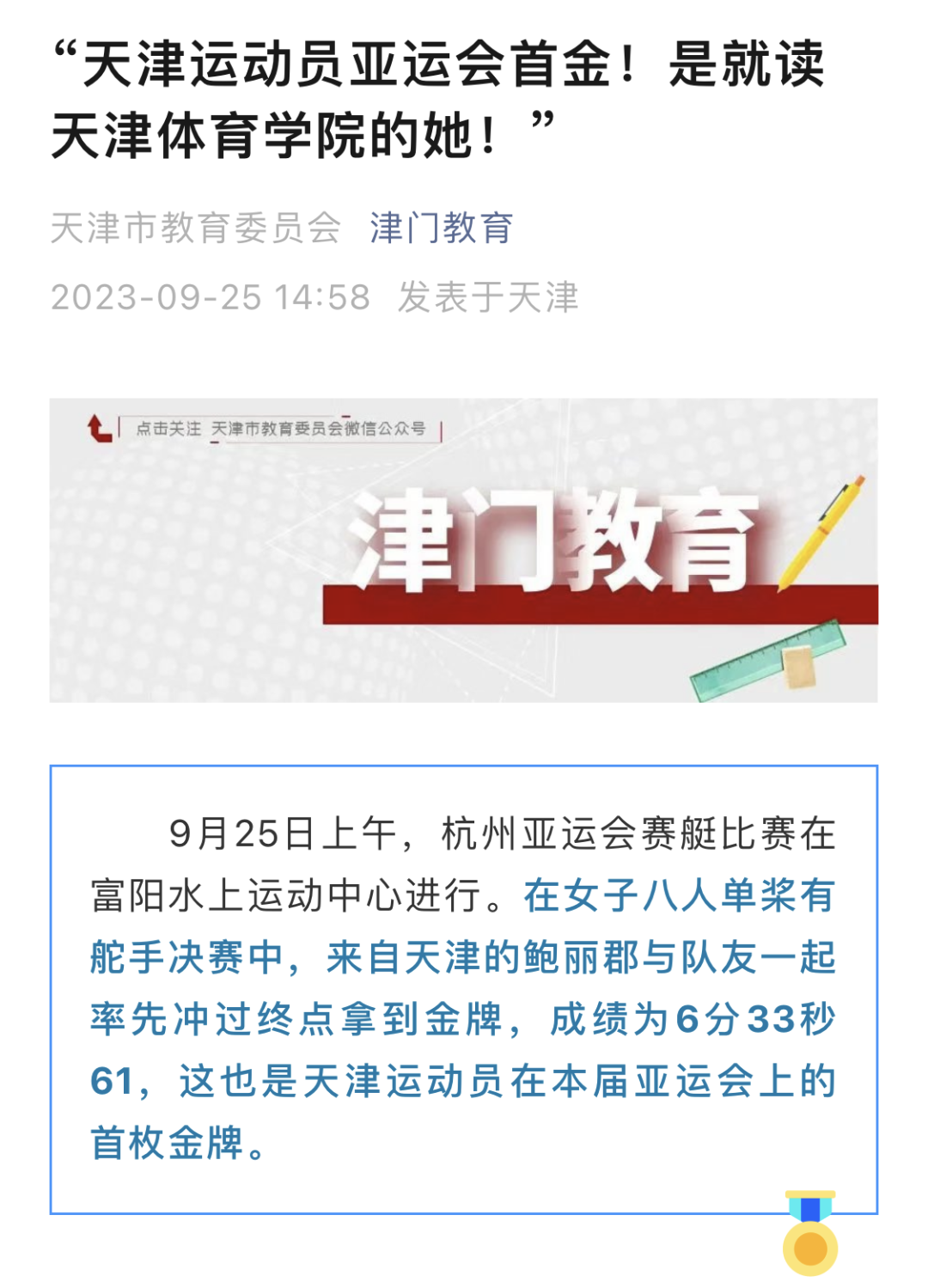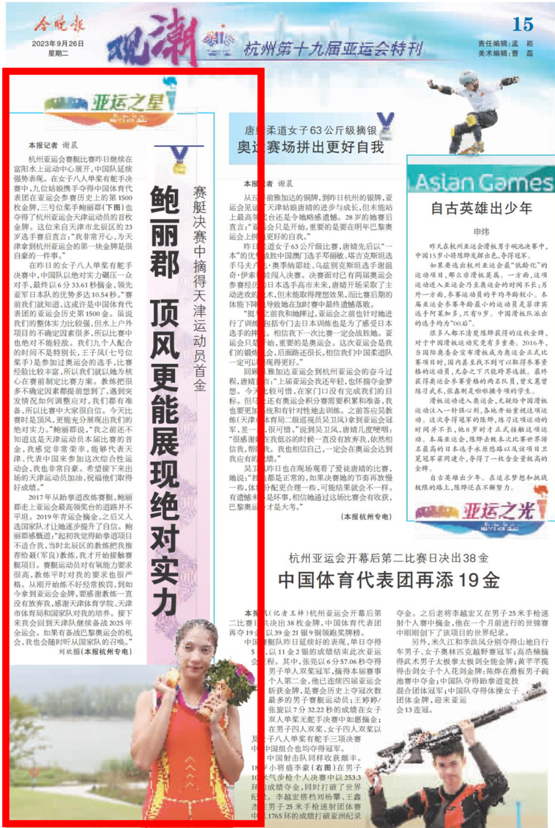9月25日,杭州第19届亚运会赛艇女子八人单桨有舵手决赛中,beat365学子鲍丽郡充分发挥技战术水平,与队友协同配合、不畏强手、顽强拼搏,以绝对优势第一条艇冲过终点,摘得该项赛事金牌。这是中国体育代表团在亚运会上收获的第1500枚金牌,是天津在本届亚运会上获得的首金。央视新闻、新华社客户端、中国新闻网、《天津日报》、津云、北方网、《今晚报》、津门教育等中央和我市多家媒体对此进行了报道。