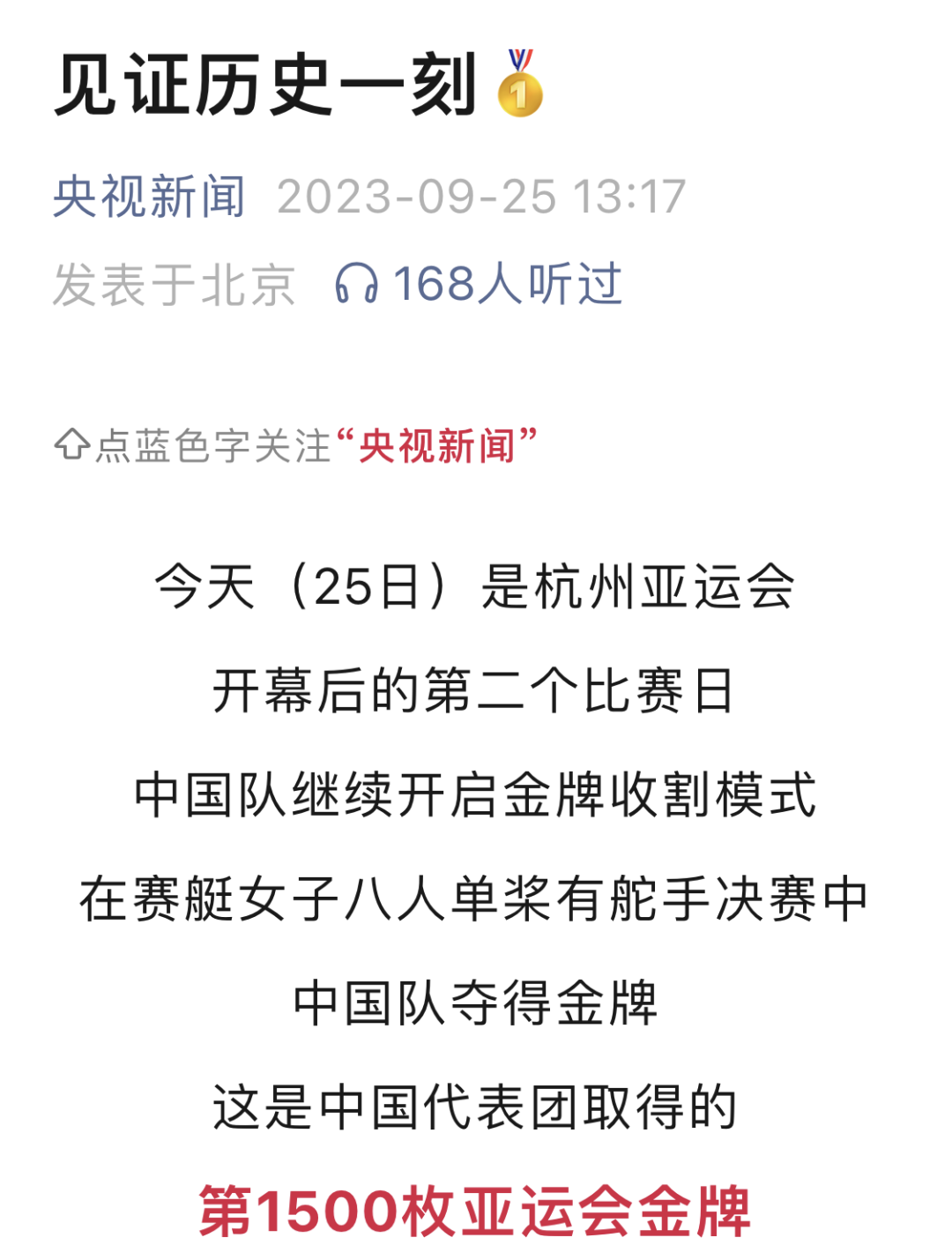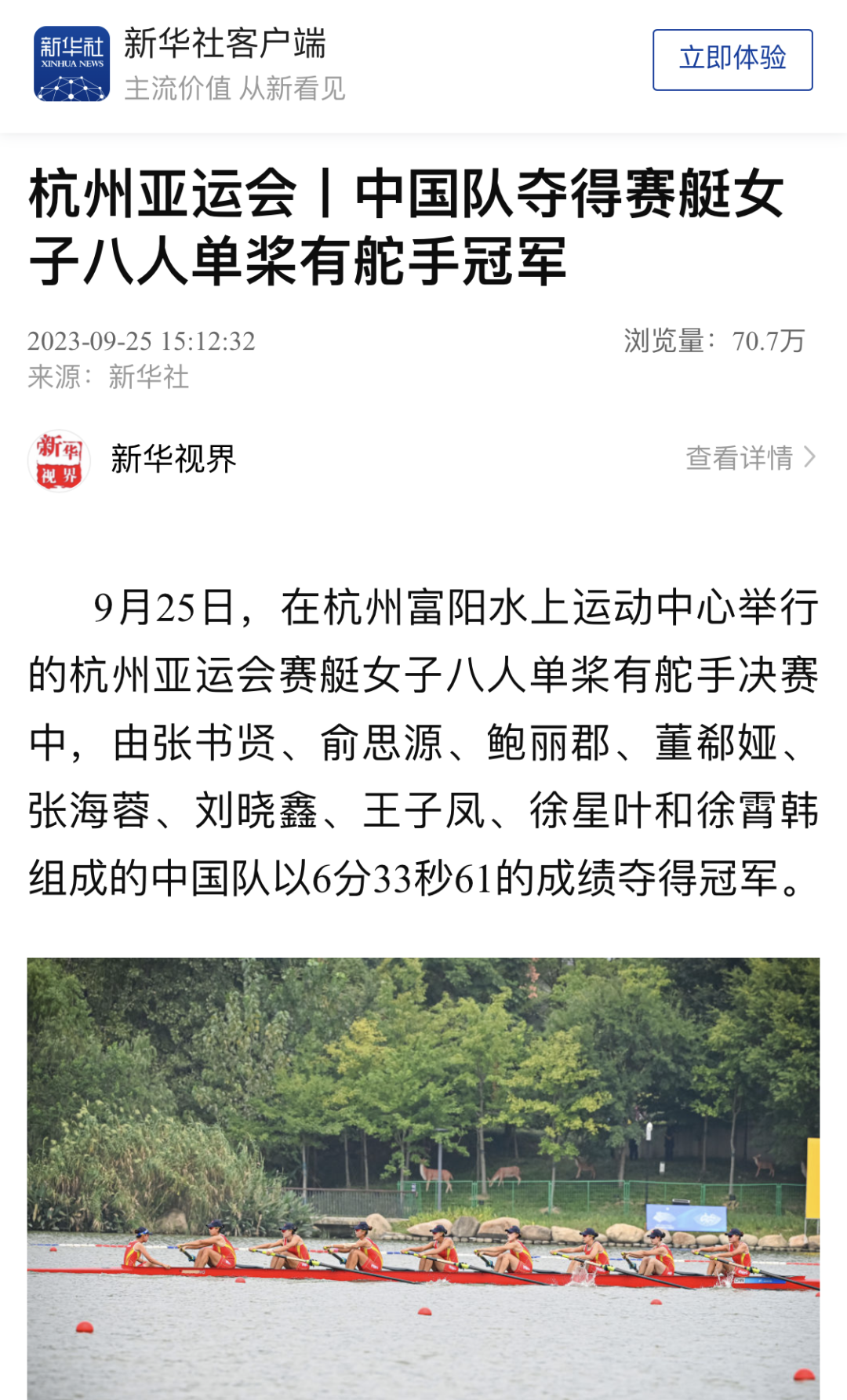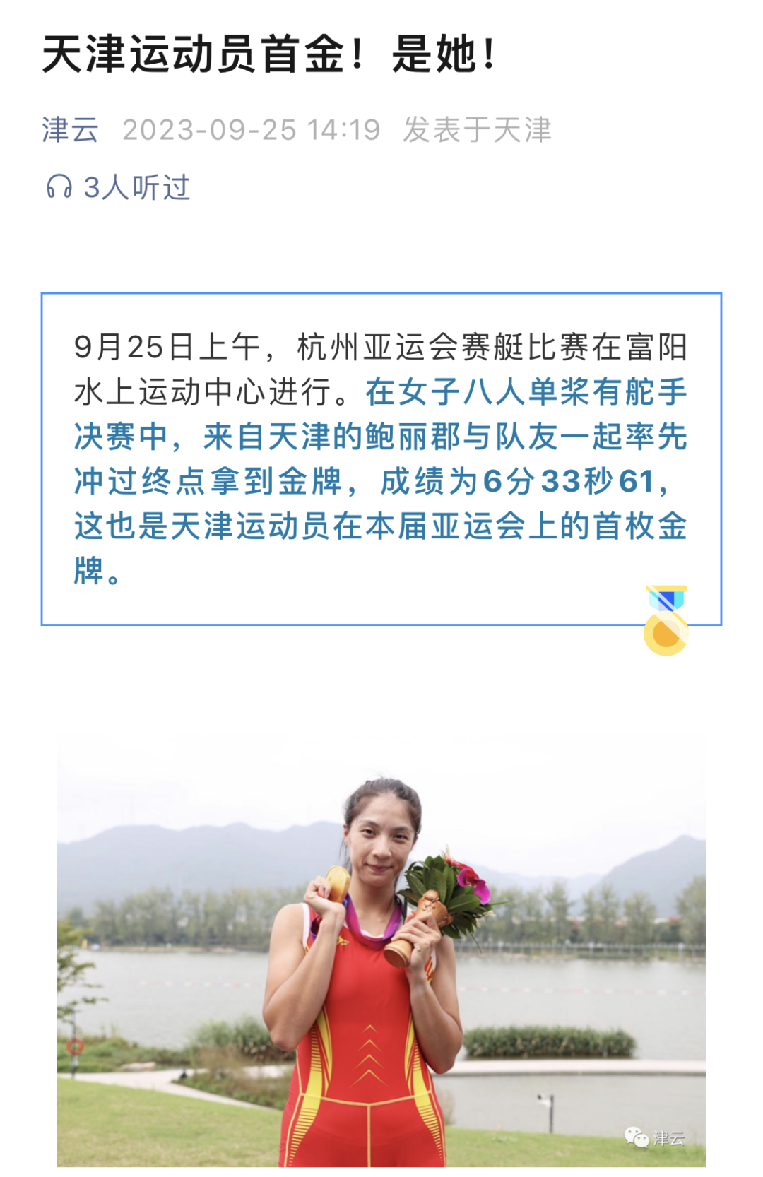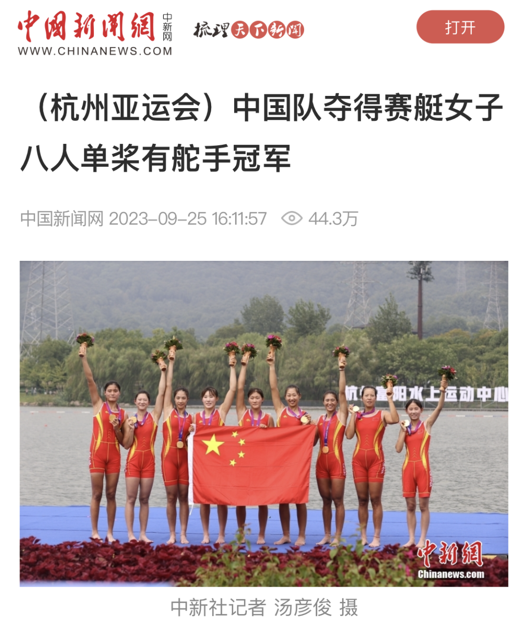 9月25日,杭州第19届亚运会赛艇女子八人单桨有舵手决赛中,beat365学子鲍丽郡充分发挥技战术水平,与队友协同配合、不畏强手、顽强拼搏,以绝对优势第一条艇冲过终点,摘得该项赛事金牌。这是中国体育代表团在亚运会上收获的第1500枚金牌,是天津在本届亚运会上获得的首金。央视新闻、新华社客户端、中国新闻网、《天津日报》、津云、北方网、《今晚报》、津门教育等中央和我市多家媒体对此进行了报道。