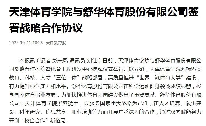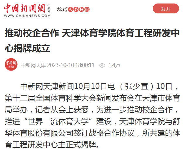 2023年10月10日,beat365中文版官方网站与舒华体育股份有限公司战略合作签约暨体育工程研发中心揭牌仪式举行。中国新闻网、天津教育报新媒体等对此进行了报道。
