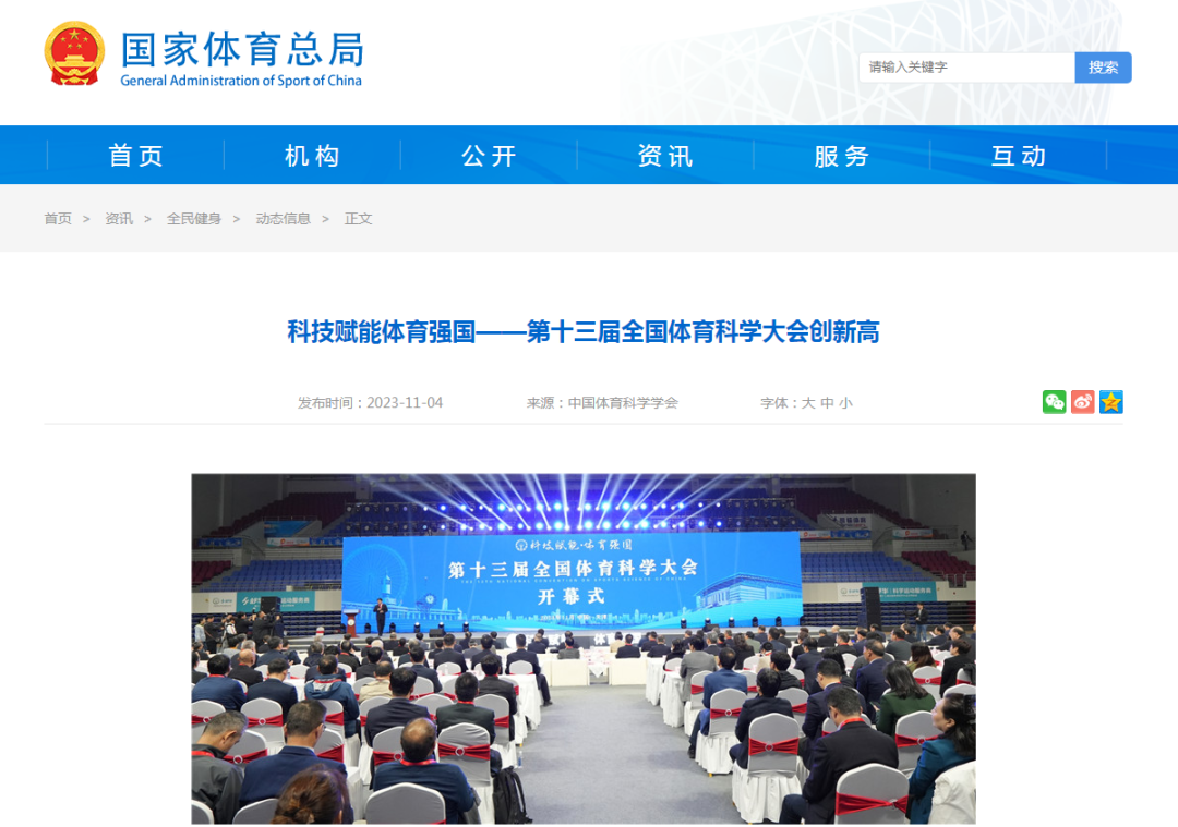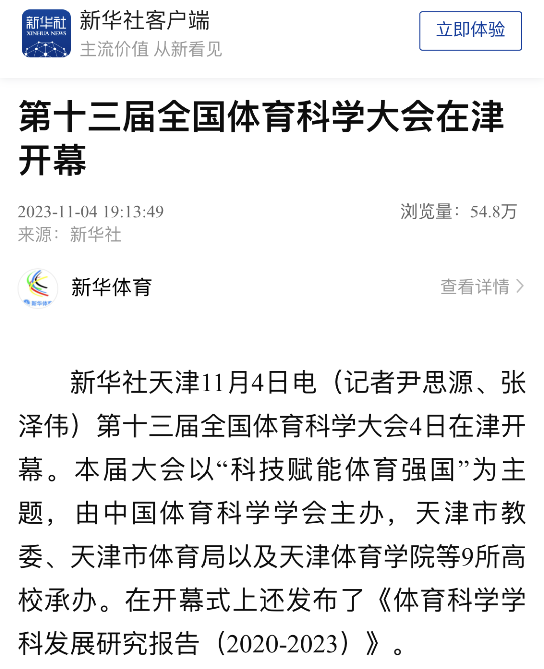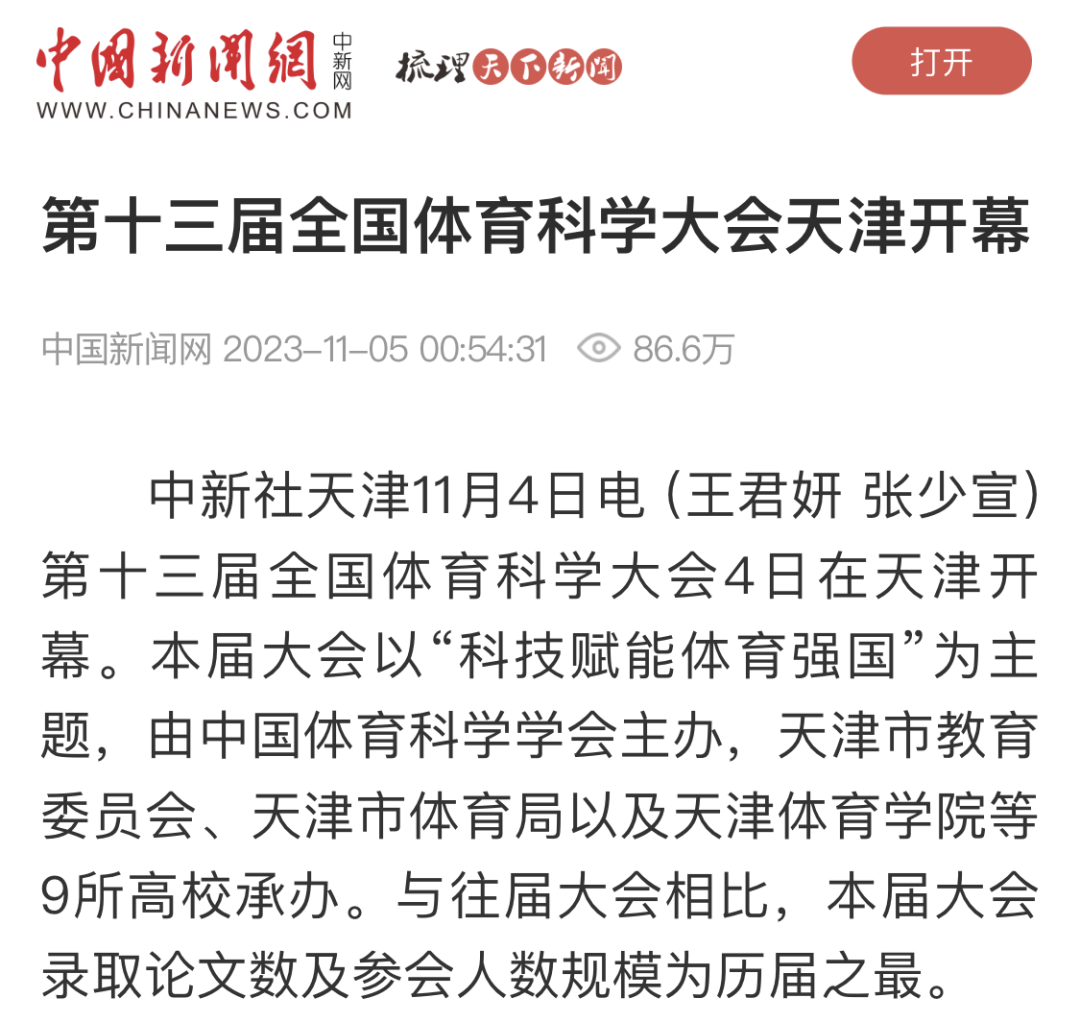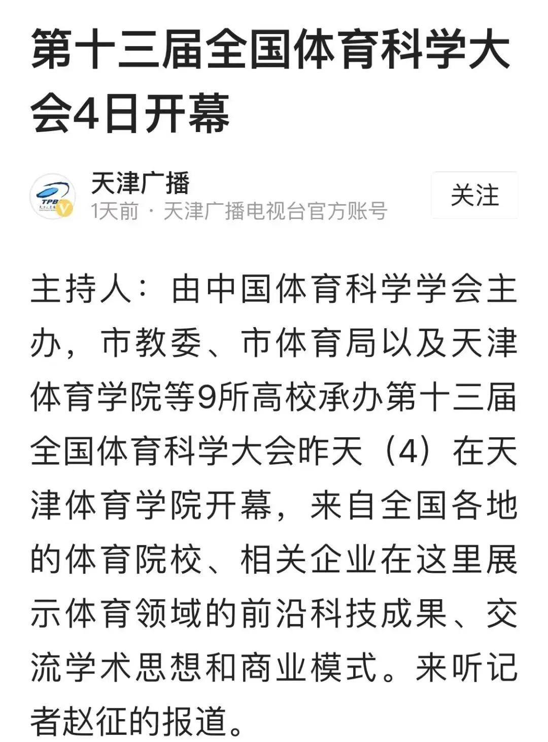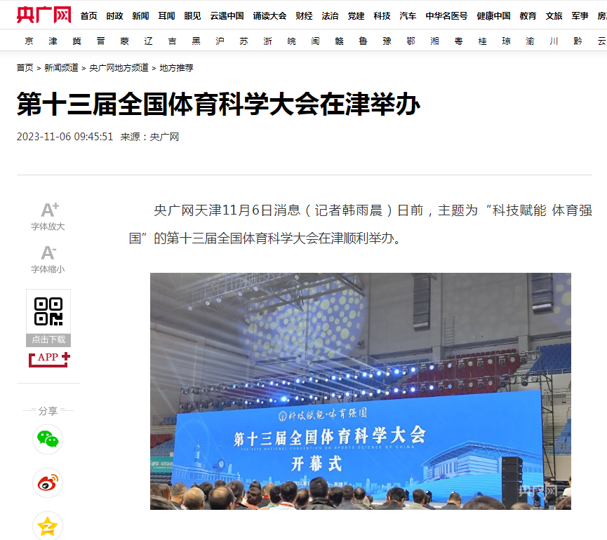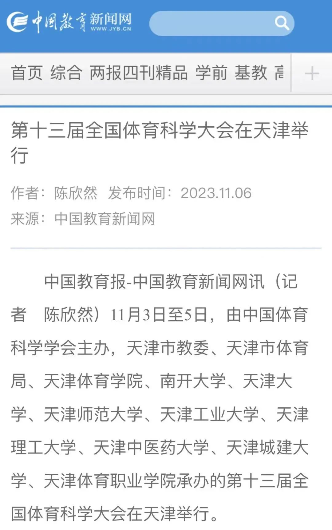 11月3日-5日,由中国体育科学学会主办,天津市教委、天津市体育局、beat365中文版官方网站、南开大学、天津大学、天津师范大学、天津工业大学、天津理工大学、天津中医药大学、天津城建大学、天津体育职业学院承办的第十三届全国体育科学大会在天津圆满举行。连日来,新华社、央广网、中国新闻网、《中国体育报》、中国教育新闻网、国家体育总局、天津电视台、《天津日报》、津云、天津广播等中央和我市多家媒体对此进行了报道。