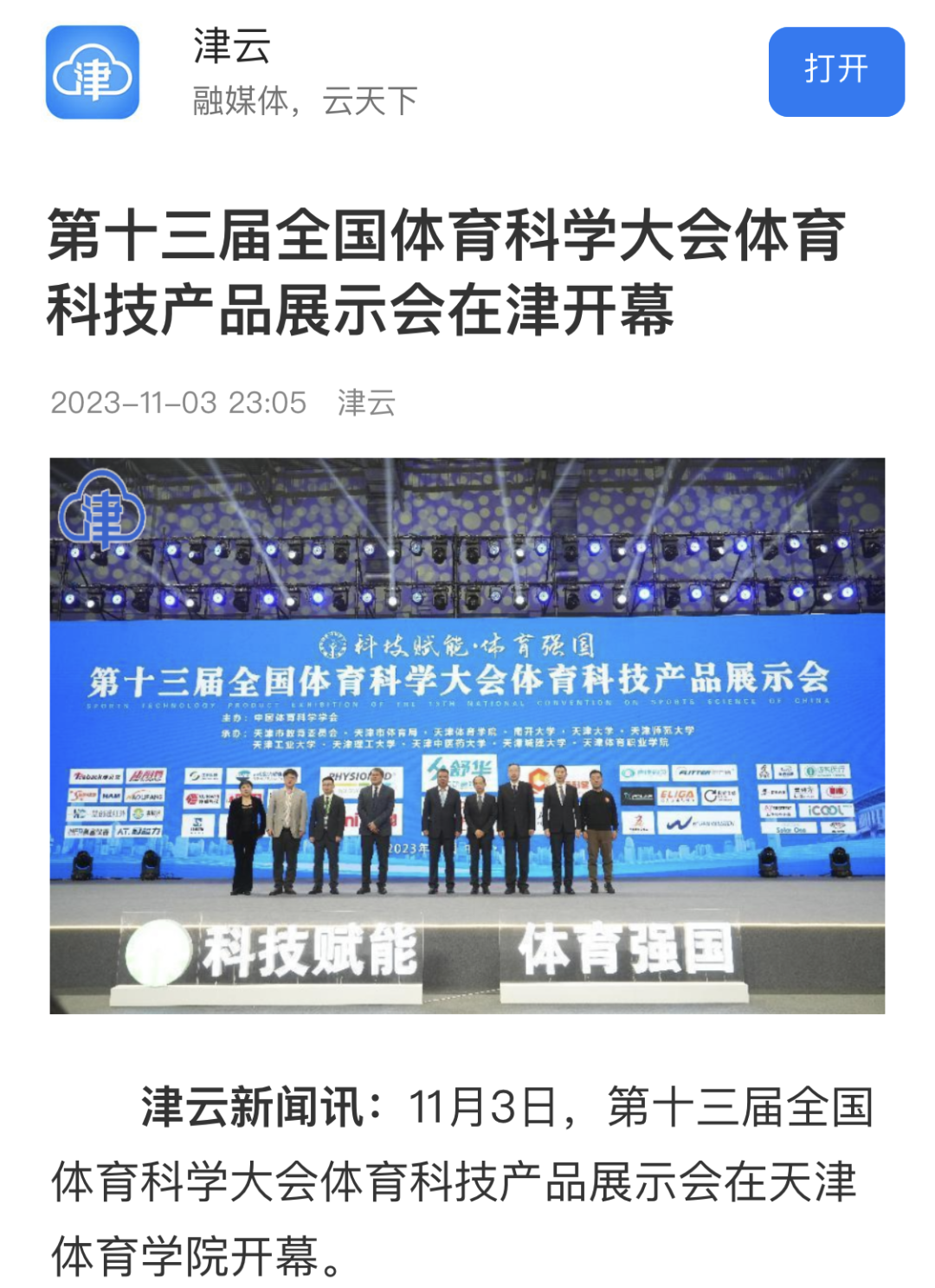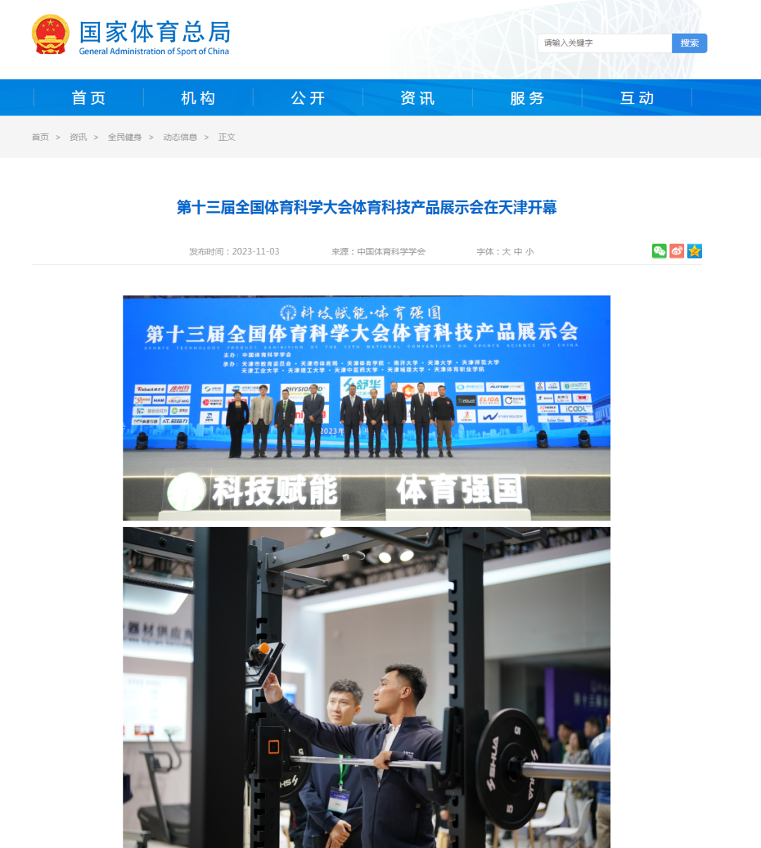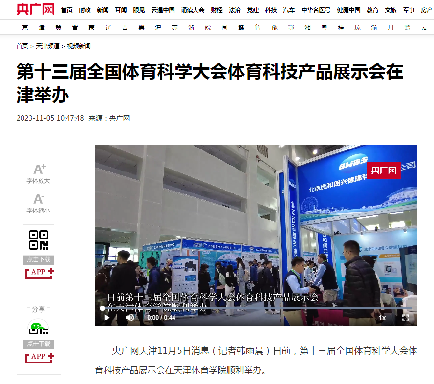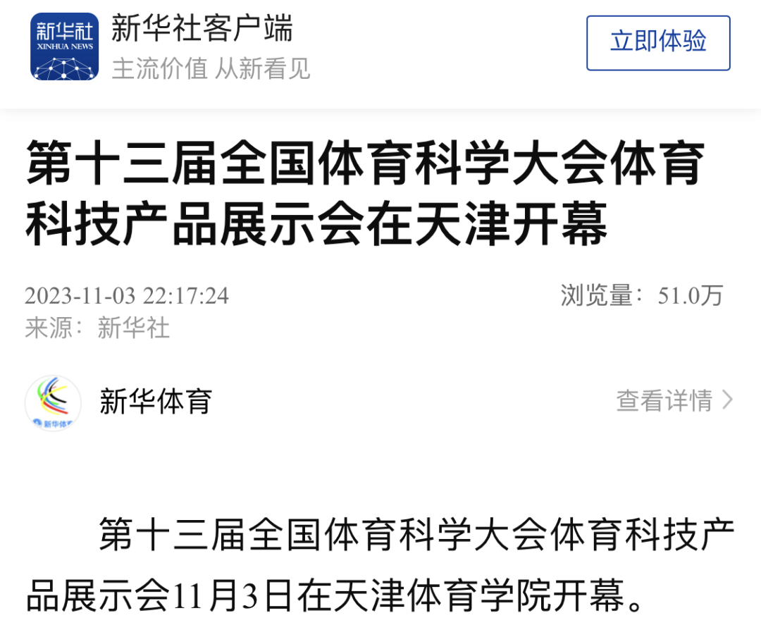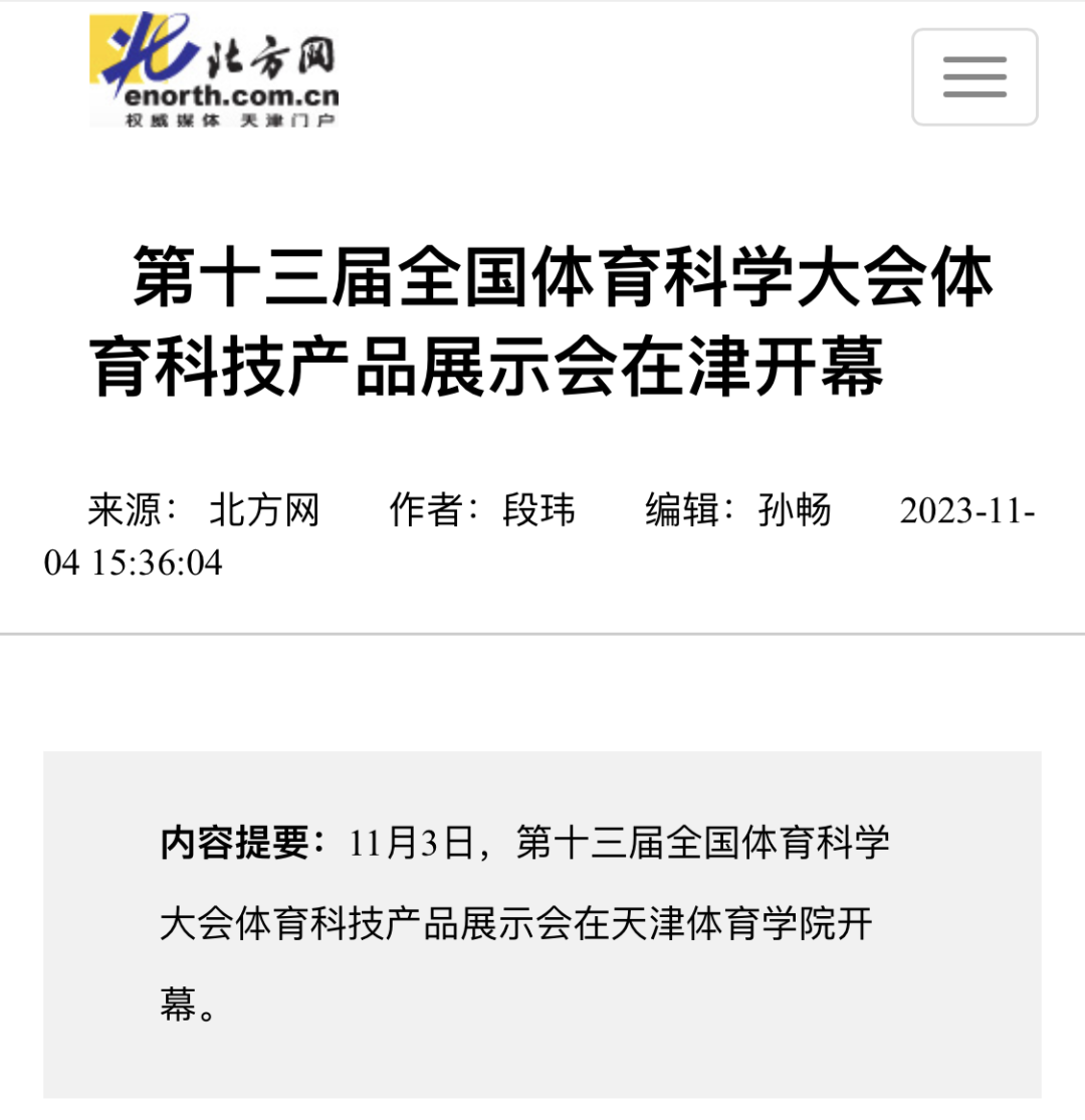 2023年11月3日下午,第十三届全国体育科学大会体育科技产品展示会在beat365中文版官方网站隆重开幕。新华社、央广网、国家体育总局官网、津云、北方网等中央和我市多家媒体对此进行了报道。