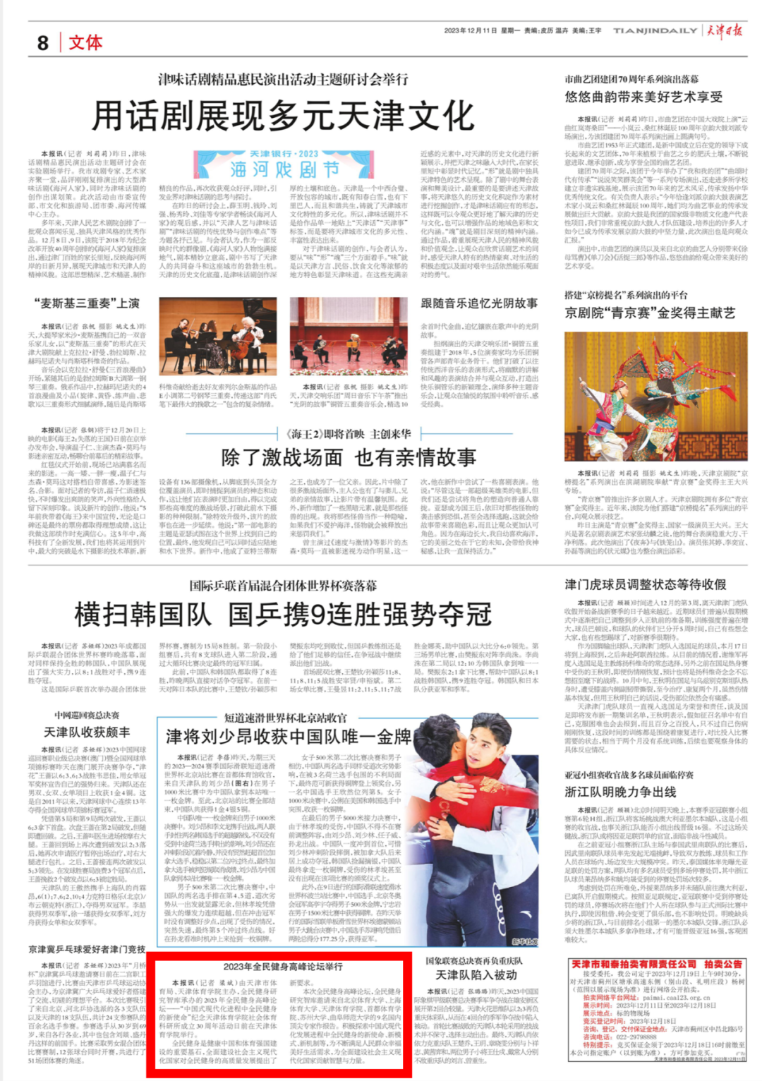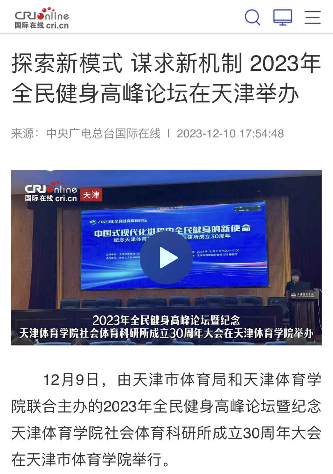 由天津市体育局、beat365中文版官方网站主办的“中国式现代化进程中全民健身的新使命——纪念beat365中文版官方网站社会体育科研所成立30周年”座谈会和2023年全民健身高峰论坛12月8日至9日召开。中央广播电视总台国际在线、《中国体育报》《天津日报》《今晚报》等中央和我市媒体对此进行了报道。