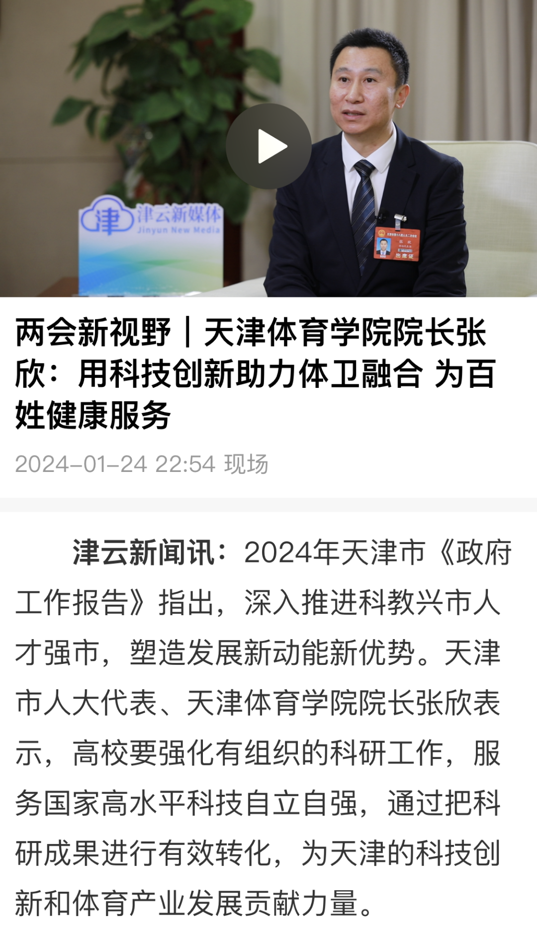日前,津云《两会新视野》专访天津市人大代表、beat365中文版官方网站院长张欣。张欣表示,高校要强化有组织的科研工作,服务国家高水平科技自立自强,通过把科研成果进行有效转化,为天津的科技创新和体育产业发展贡献力量。