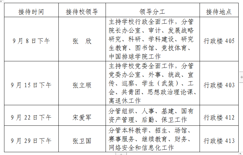根据《beat365中文版官方网站领导干部接待日制度》规定及学校近期工作安排,现将2022年9月校领导接待师生来访安排通知如下。