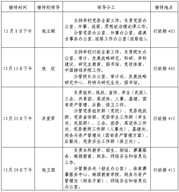 根据《beat365中文版官方网站领导干部接待日制度》规定及学校近期工作安排,现将2022年12月校领导接待师生来访安排通知如下。