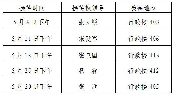 根据《beat365中文版官方网站领导干部接待日制度》规定及学校近期工作安排,现将2023年5月校领导接待师生来访安排通知如下: