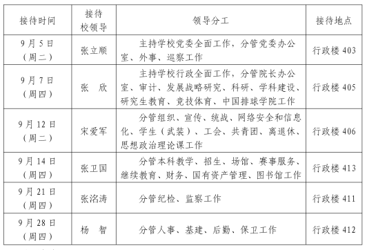 根据《beat365中文版官方网站领导干部接待日制度》规定及学校近期工作安排,现将2023年9月校领导接待师生来访安排通知如下:相关事项: