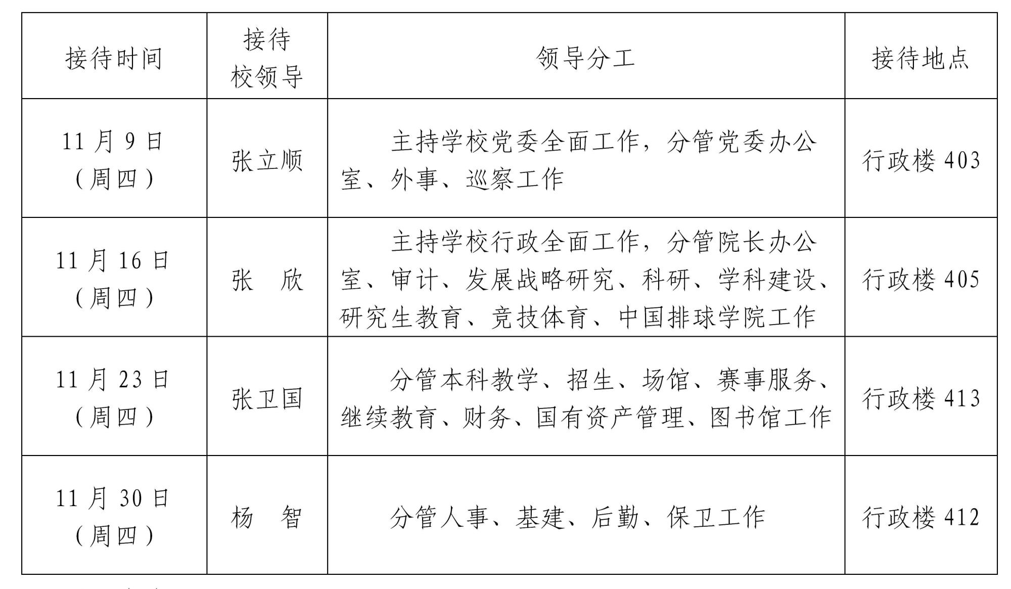 根据《beat365中文版官方网站领导干部接待日制度》规定及学校近期工作安排,现将2023年11月校领导接待师生来访安排通知如下: