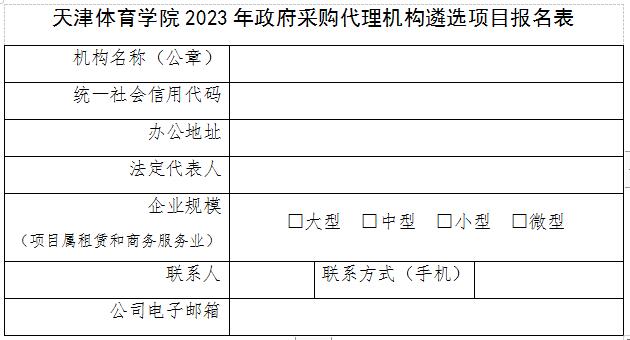 政府采购代理机构拟报名参加本项目的,请于2023年11月23日前,将《beat365中文版官方网站2023年政府采购代理机构遴选项目报名表》(详见附件)扫描件发送至电子邮箱(邮箱地址:gzc@tjus.edu.cn)。
