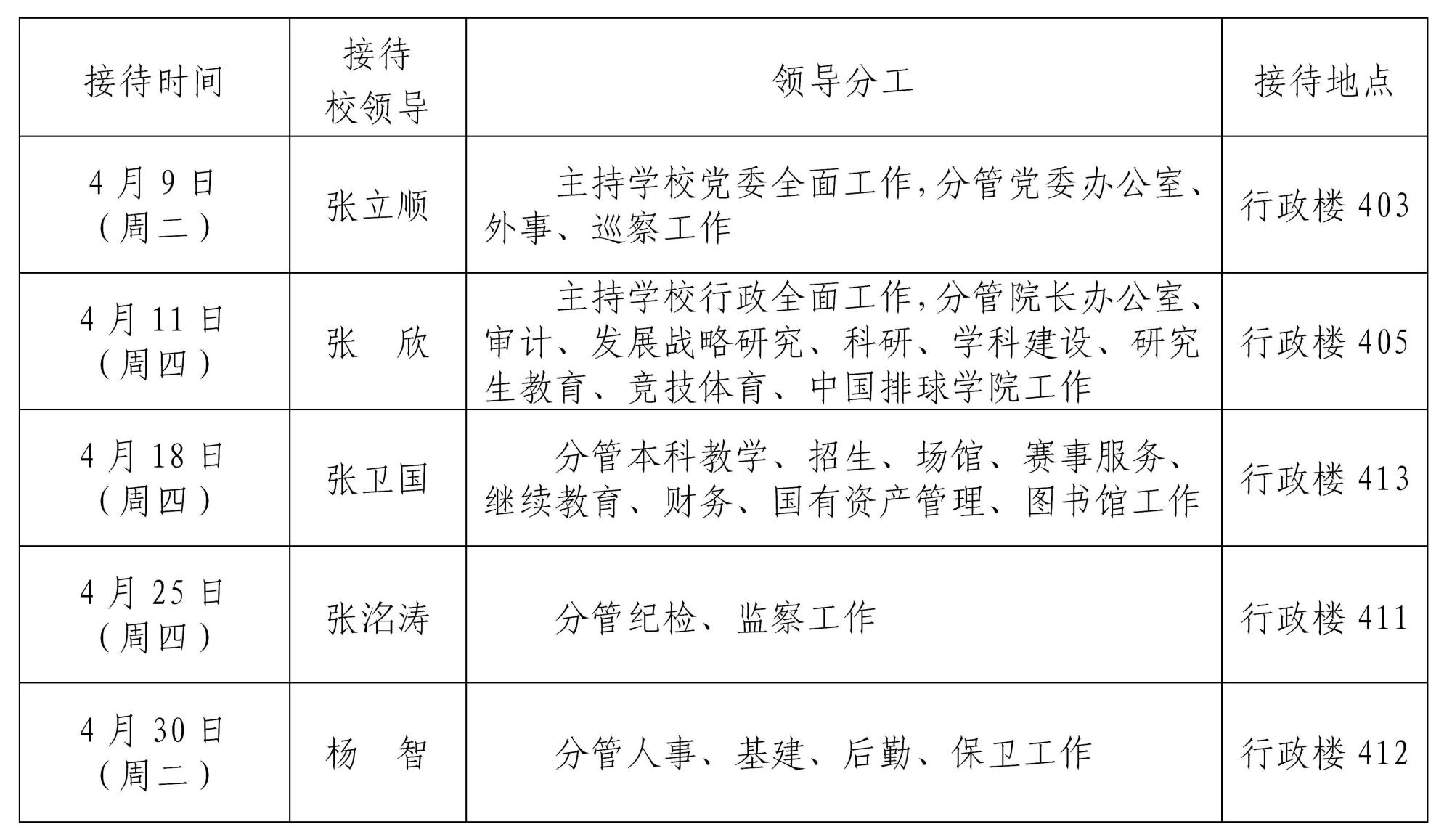 根据《beat365中文版官方网站领导干部接待日制度》规定及学校近期工作安排,现将2024年4月校领导接待师生来访安排通知如下: